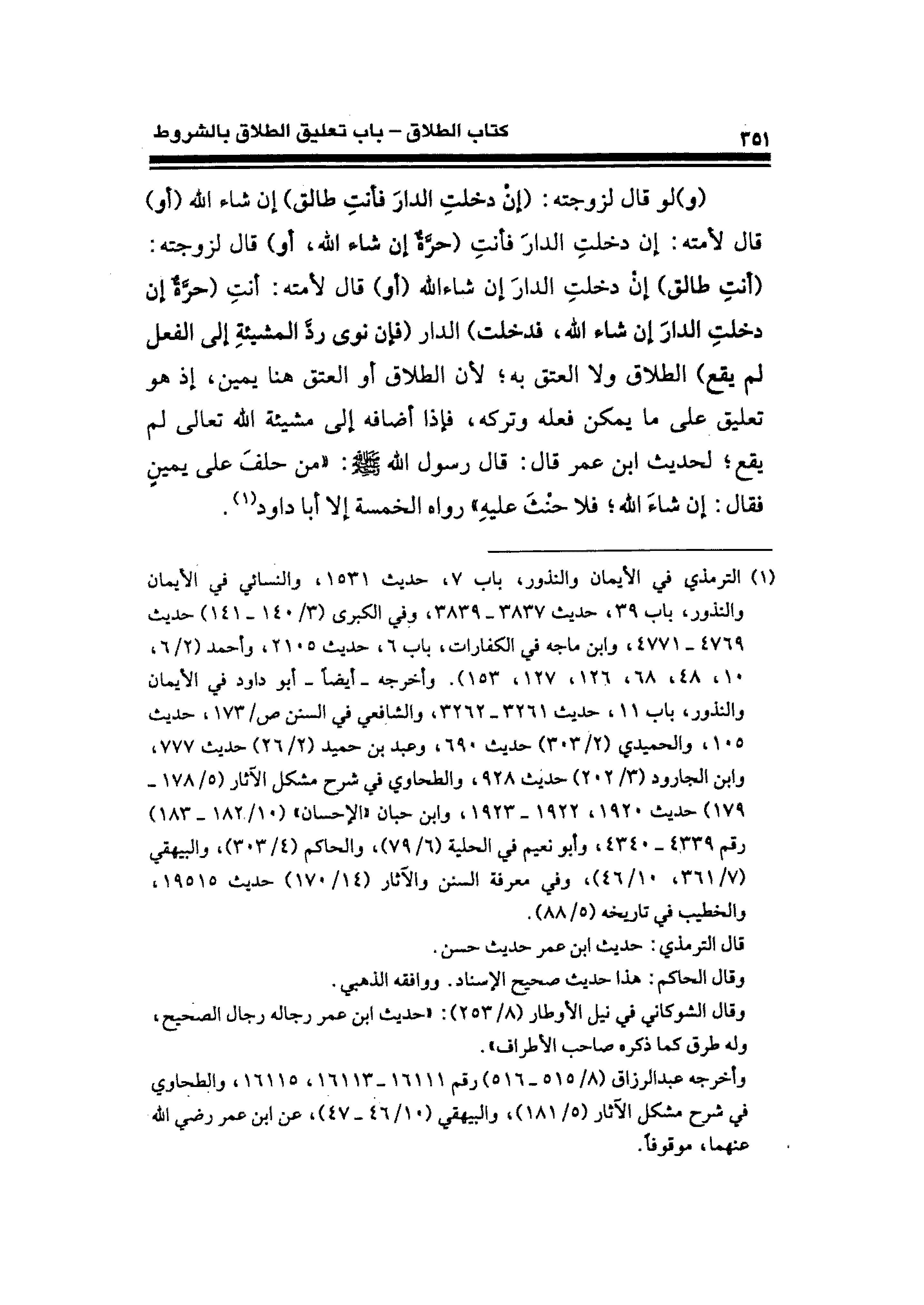 (و) لو قال لزوجته: (إنْ دخلتِ الدارَ فأنتِ طالق) إن شاء الله (أو) قال لأمته: إن دخلتِ الدارَ فأنتِ (حرَّة إن شاء الله، أو) قال لزوجته: (أنتِ طالق) إنْ دخلتِ الدارَ إن شاءالله (أو) قال لأمته: أنتِ (حرَّةٌ: إن دخلتِ الدارَ إن شاء الله، فدخلت) الدار (فإن نوى ردَّ المشيئةِ إلى الفعل لم يقع) الطلاق ولا العتق به؛ لأن الطلاق أو العتق هنا يمين، إذ هو تعليق على ما يمكن فعله وتركه، فإذا أضافه إلى مشيئة الله تعالى لم يقع؛ لحديث ابن عمر قال: قال رسول الله - صلى الله عليه وسلم -: "من حلف على يمينٍ فقال: إن شاءَ الله؛ فلا حنْثَ عليهِ" رواه الخمسة إلا أبا داود (¬١).