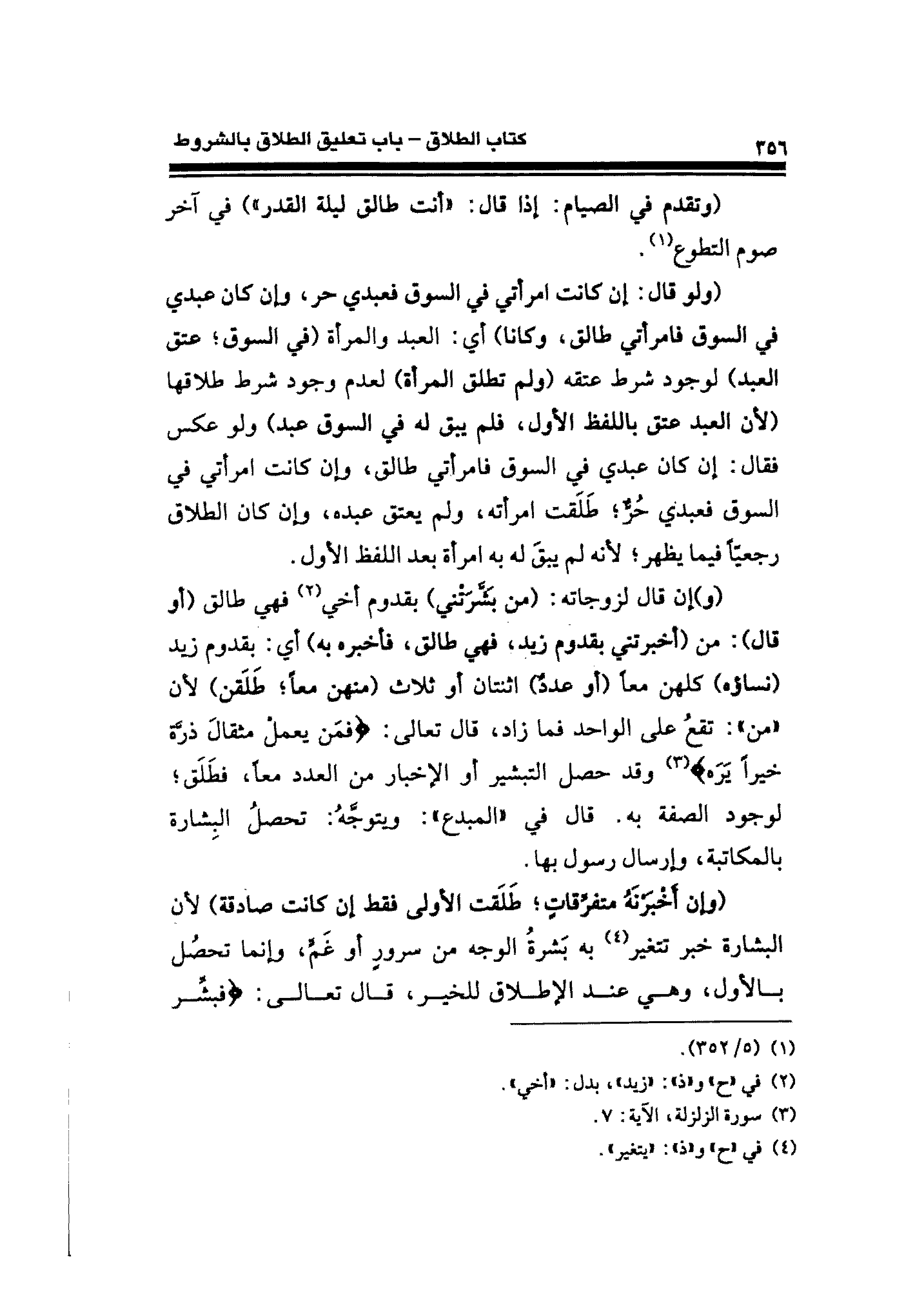 (و) إن قال لزوجاته: (من بَشَّرتني) بقدوم أخي (¬٢) فهي طالق (أو قال): من (أخبرتني بقدوم زيد، فهي طالق، فأخبره به) أي: بقدوم زيد (نساؤه) كلهن معًا (أو عددٌ) اثنتان أو ثلاث (منهن معًا؛ طَلَقن) لأن "من": تقعُ على الواحد فما زاد، قال تعالى: {فَمَنْ يَعْمَلْ مِثْقَال ذَرَّةٍ خَيرًا يَرَهُ} (¬٣) وقد حصل التبشير أو الإخبار من العدد معًا، فطَلَق؛ لوجود الصفة به. قال في "المبدع": ويتوجَّة: تحصل البِشارة بالمكاتبة، وإرسال رسول بها.