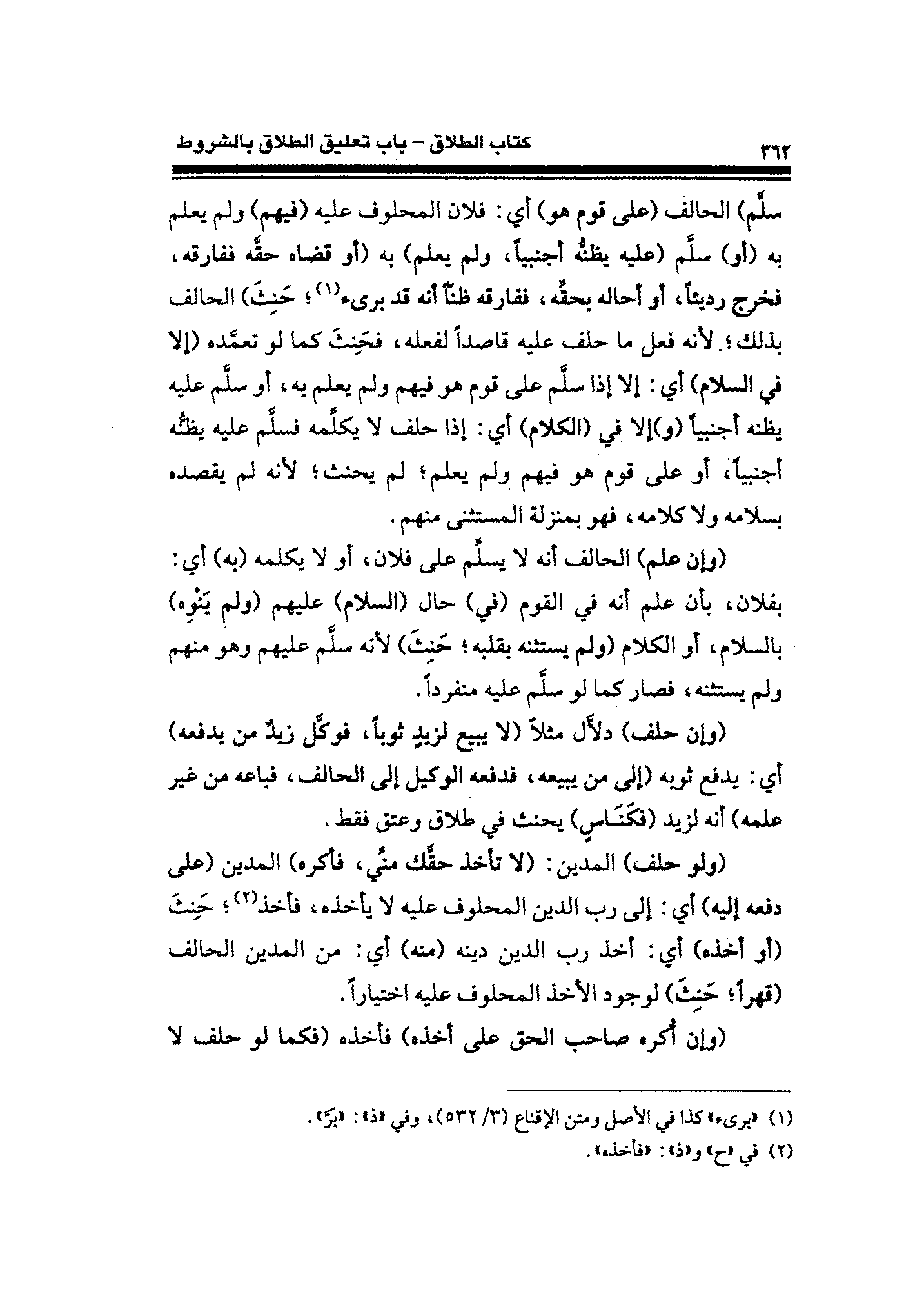 سلَّم) الحالف (على قوم هو) أي: فلان المحلوف عليه (فيهم) ولم يعلم به (أو) سلَّم (عليه يظنُّه أجنبيًّا، ولم يعلم) به (أو قضاه حقَّه ففارقه، فخرج رديئًا، أو أحاله بحقِّه، ففارقه ظنًّا أنه قد برئ (¬١)؛ حَنِثَ) الحالف بذلك؛ لأنه فعل ما حلف عليه قاصدًا لفعله، فحَنثَ كما لو تعمَّده (إلا في السلام) أي: إلا إذا سلَّم على قوم هو فيهم ولم يعلم به، أو سلَّم عليه يظنه أجنبيًّا (و) إلا في (الكلام) أي: إذا حلف لا يكلِّمه فسلَّم عليه يظنُّه أجنبيًّا، أو على قوم هو فيهم ولم يعلم؛ لم يحنث؛ لأنه لم يقصده بسلامه ولا كلامه، فهو بمنزلة المستثنى منهم.