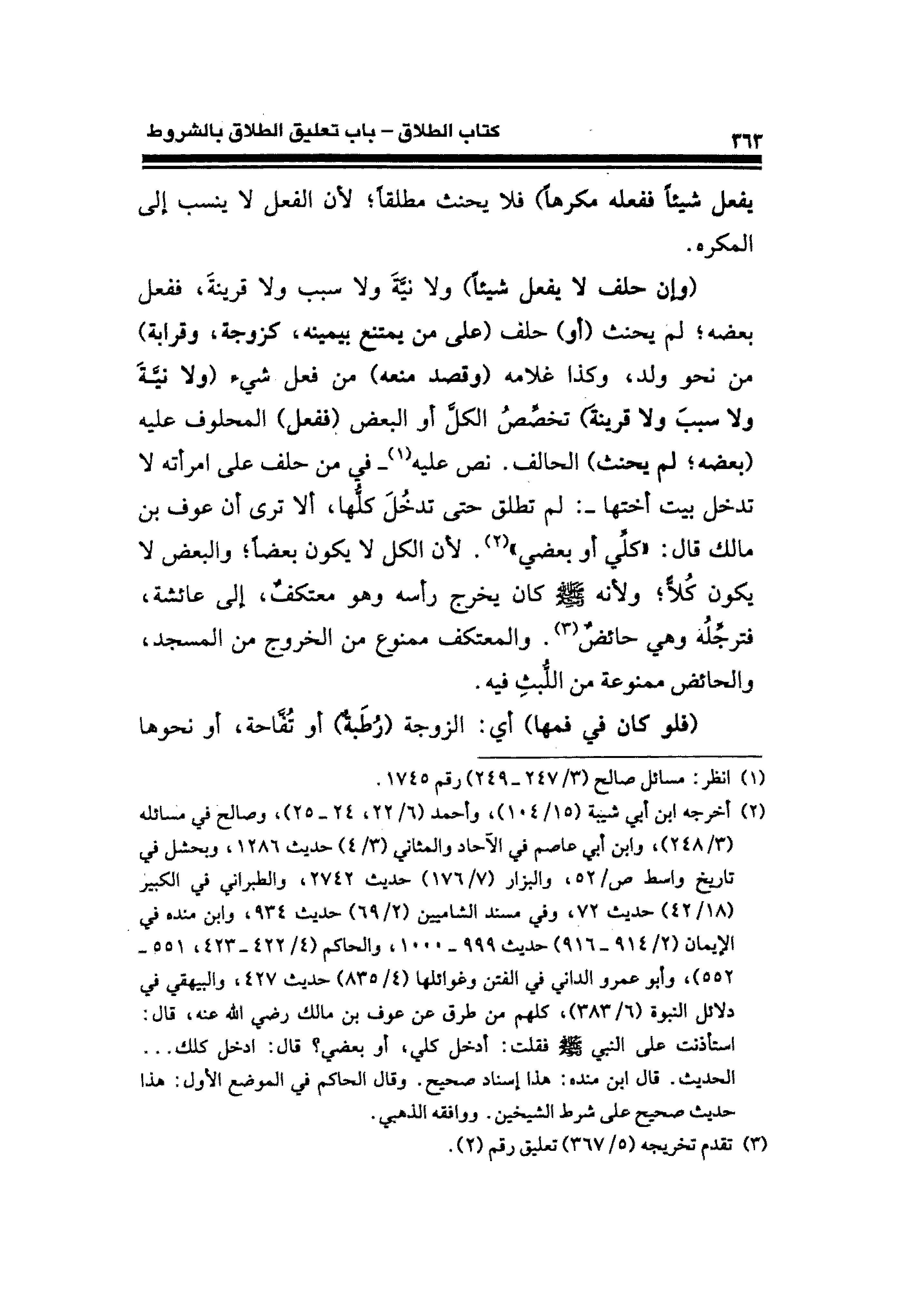 (وإن حلف لا يفعل شيئًا) ولا نيَّةَ ولا سبب ولا قرينةَ، ففعل بعضه؛ لم يحنث (أو) حلف (على من يمتنع بيمينه، كزوجة، وقرابة) من نحو ولد، وكذا غلامه (وقصد منعه) من فعل شيء (ولا نيَّةَ ولا سببَ ولا قرينةَ) تخصِّصُ الكلَّ أو البعض (ففعل) المحلوف عليه (بعضه؛ لم يحنث) الحالف. نص عليه (¬١) -في من حلف على امرأته لا تدخل بيت أختها-: لم تطلق حتى تدخُلَ كلُّها، ألا ترى أن عوف بن مالك قال: "كلِّي أو بعضي" (¬٢). لأن الكل لا يكون بعضًا؛ والبعض لا يكون كلًّا؛ ولأنه - صلى الله عليه وسلم - كان يخرج رأسه وهو معتكفٌ، إلى عائشة، فترجِّلُه وهي حائضٌ (¬٣). والمعتكف ممنوع من الخروج من المسجد، والحائض ممنوعة عن اللُّبثِ فيه.