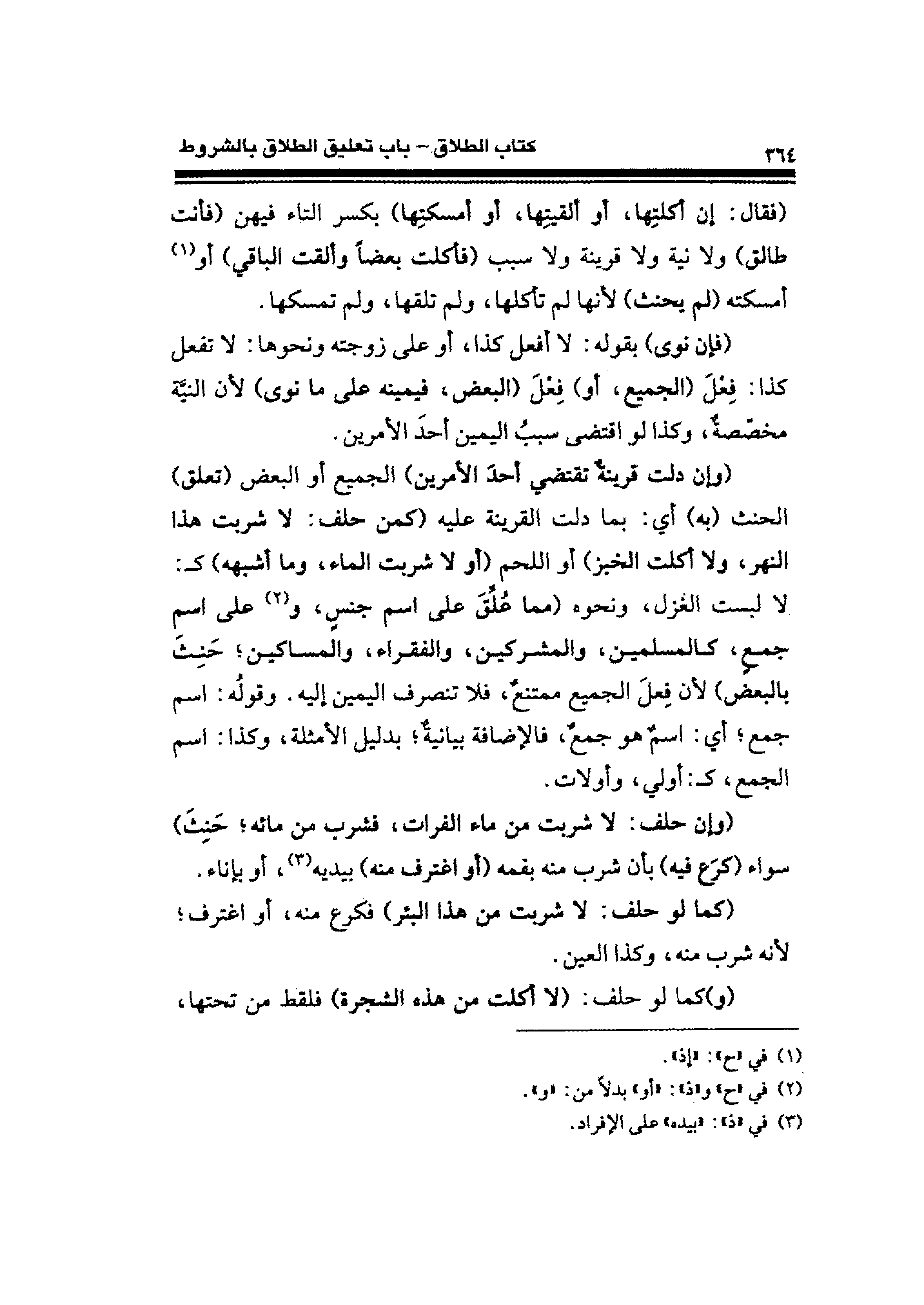 (وإن دلت قرينةٌ تقتضي أحدَ الأمرين) الجميع أو البعض (تعلق) الحنث (به) أي: بما دلت القرينة عليه (كمن حلف: لا شربت هذا النهر، ولا أكلت الخبز) أو اللحم (أو لا شربت الماء، وما أشبهه) كـ: لا لبست الغزل، ونحوه (مما عُلِّقَ على اسم جنسٍ، و (¬٢) على اسم جمعٍ، كالمسلمين، والمشركين، والفقراء، والمساكين؛ حَنِثَ بالبعض) لأن فِعلَ الجميع ممتنعٌ، فلا تنصرف اليمين إليه. وقولُه: اسم جمع؛ أي: اسمٌ هو جمعٌ، فالإضافة بيانيةٌ؛ بدليل الأمثلة، وكذا: اسم الجمع، كـ: أولي، وأولات.