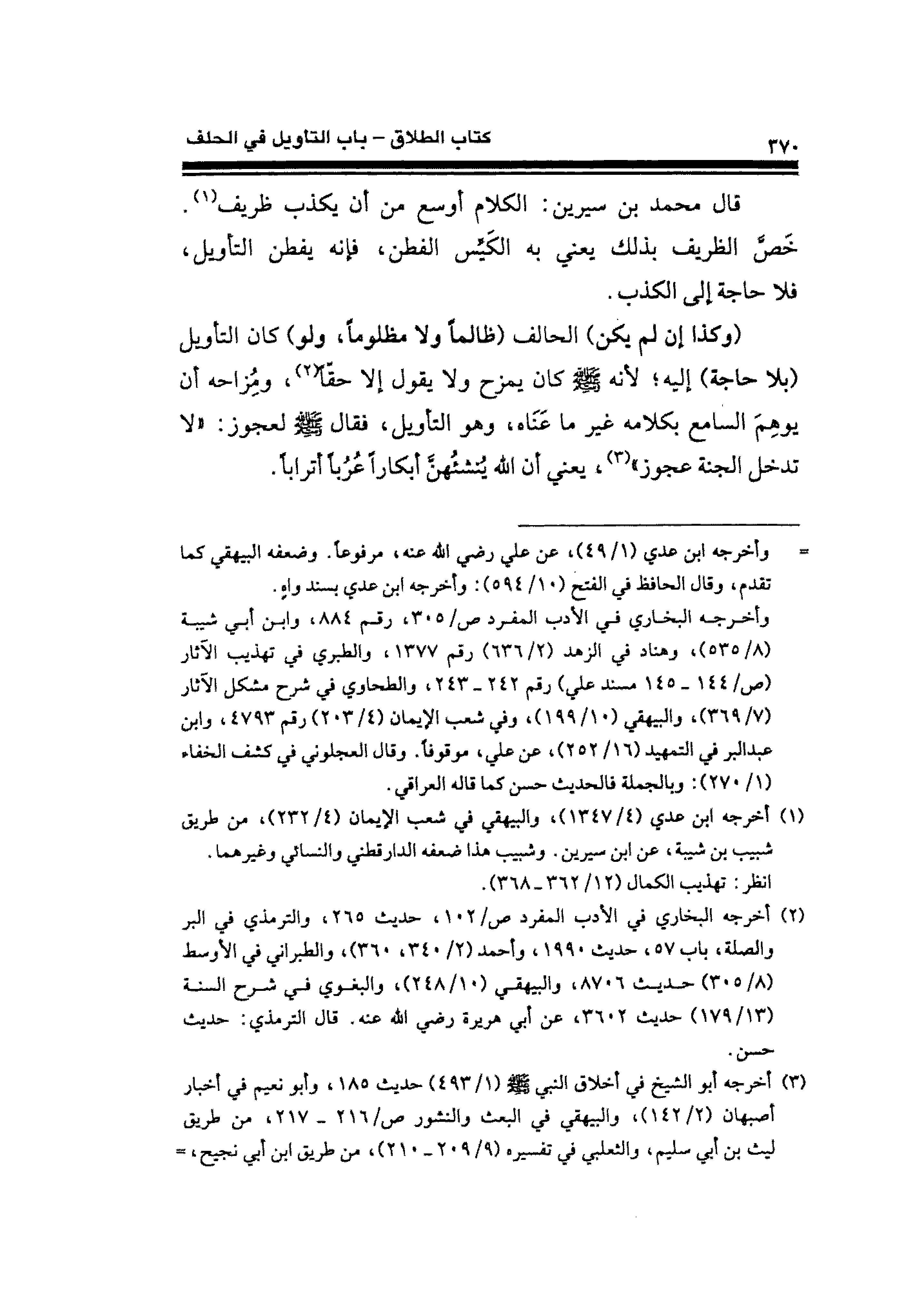 قال محمد بن سيرين: الكلام أوسع من أن يكذب ظريف (¬١). خَصَّ الظريف بذلك يعني به الكَيِّس الفطن، فإنه يفطن التأويل، فلا حاجة إلى الكذب.