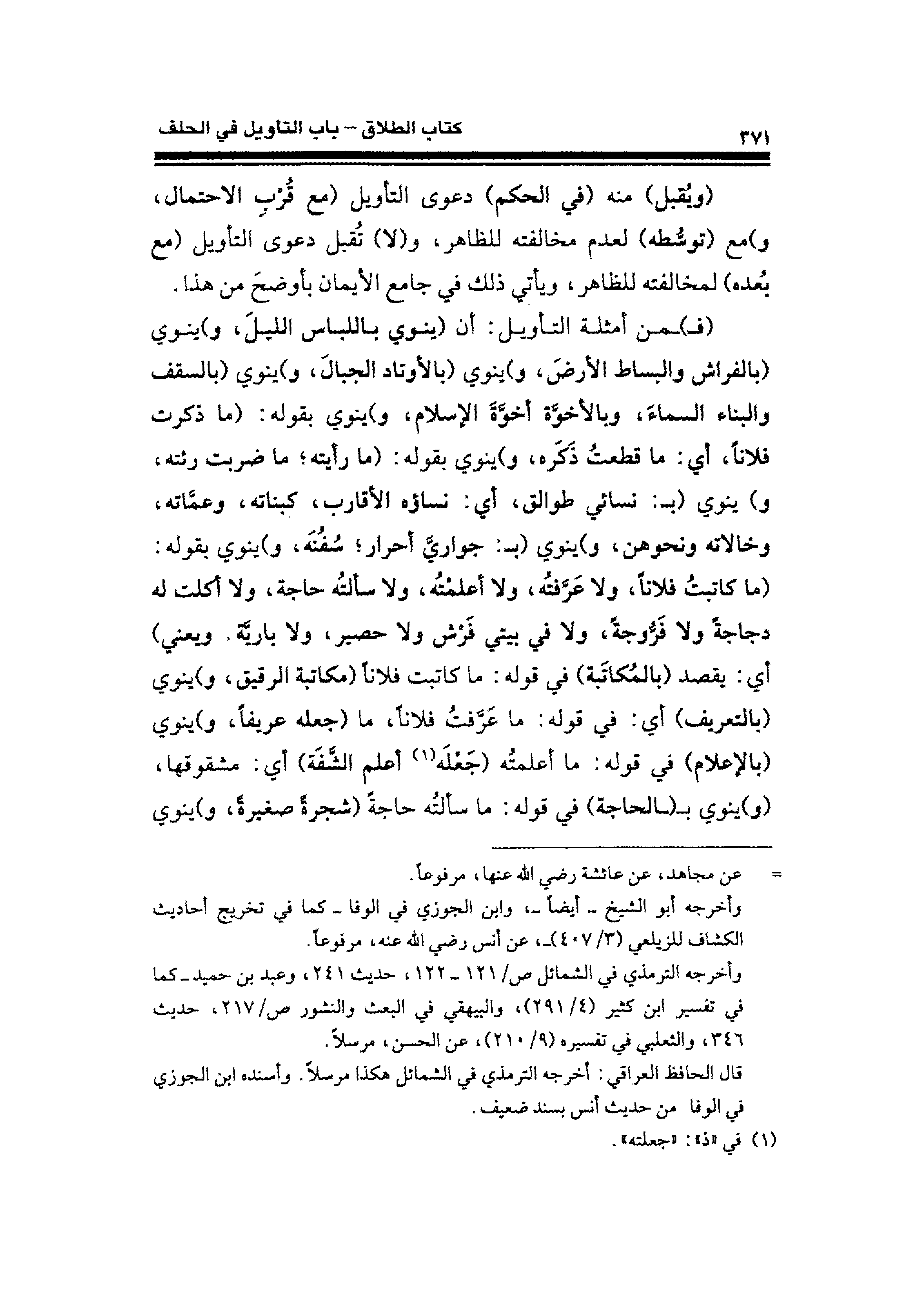(فـ) ـمن أمثلة التأويل: أن (ينوي باللباس الليلَ، و) ينوي (بالفراش والبساط الأرض، و) ينوي (بالأوتاد الجبالَ، و) ينوي (بالسقف والبناء السماءَ، وبالأخوَّة أخوَّةَ الإسلام، و) ينوي بقوله: (ما ذكرت فلانًا، أي: ما قطعتُ ذكره، و) ينوي بقوله: (ما رأيته؛ ما ضربت رئته، و) ينوي (بـ: نسائي طوالق، أي: نساؤه الأقارب، كبناته، وعماته، وخالاته ونحوهن، و) ينوي (بـ: جواري أحرار؛ سُفُنَه، و) ينوي بقوله: (ما كاتبتُ فلانًا، ولا عرَّفته، ولا أعلمته، ولا سألتُه حاجة، ولا أكلت له دجاجةً ولا فَرُّوجةً، ولا في بيتي فَرْش ولا حصير، ولا باريَّة. ويعني) أي: يقصد (بالمُكاتَبة) في قوله: ما كاتبت فلانًا مكاتبة الرقيق، و) ينوي (بالتعريف) أي: في قوله: ما عَرفتُ فلانًا، ما (جعله عريفًا، و) ينوي (بالإعلام) في قوله: ما أعلمتُه (جَعلَه (¬١) أعلم الشَّفَة) أي: مشقوقها، (و) ينوي بـ (ـالحاجة) في قوله: ما سألتُه حاجةً (شجرةً صغيرةً، و) ينوي