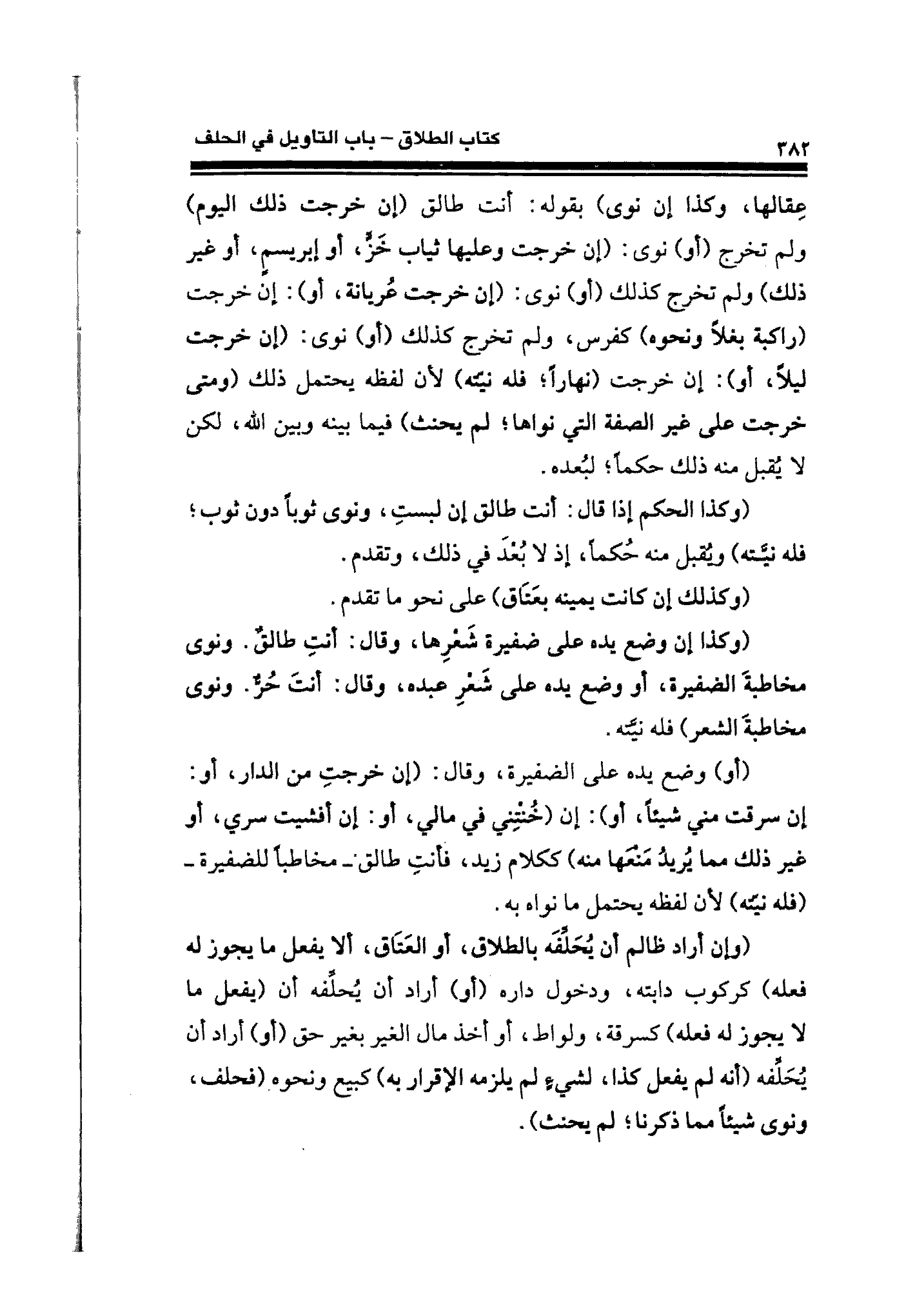 (أو) وضع يده على الضفيرة، وقال: (إن خرجتِ من الدار، أو: إن سرقت مني شيئًا، أو): إن (خُنْتِني في مالي، أو: إن أفشيت سري، أو غير ذلك مما يُريدُ مَنْعَها منه) ككلام زيد، فأنتِ طالق -مخاطبًا للضفيرة- (فله نيَّته) لأن لفظه يحتمل ما نواه به.