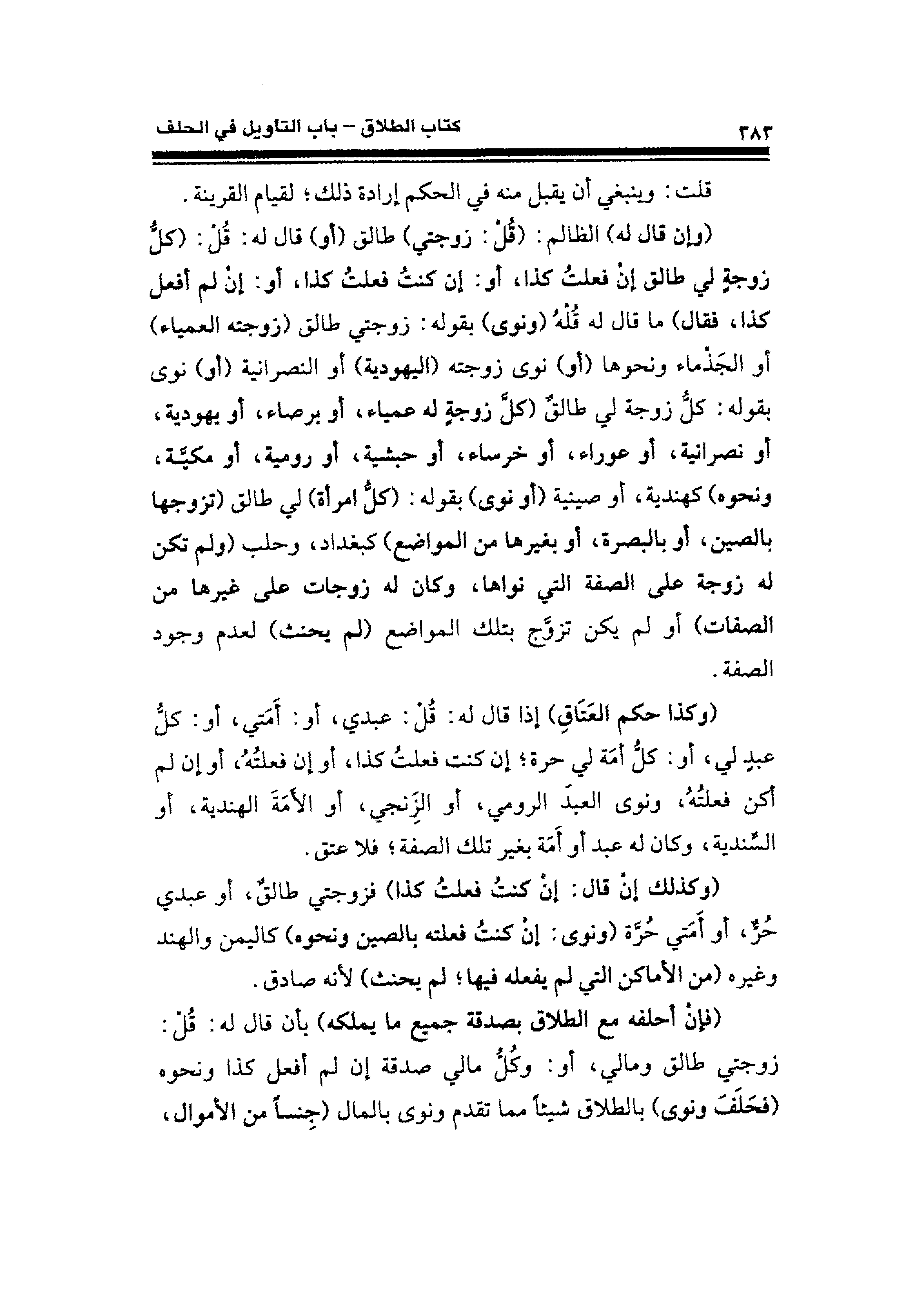 (وإن قال له) الظالم: (قُلْ: زوجتي) طالق (أو) قال له: قُلْ: (كلُّ زوجةٍ لي طالق إنْ فعلتُ كذا، أو: إن كنتُ فعلتُ كذا، أو: إنْ لم أفعل كذا، فقال) ما قال له فُلْهُ (ونوى) بقوله: زوجي طالق (زوجته العمياء) أو الجَذْماء ونحوها (أو) نوى زوجته (اليهودية) أو النصرانية (أو) نوى بقوله: كلُّ زوجة لي طالقٌ (كلَّ زوجةٍ له عمياء، أو برصاء، أو يهودية، أو نصرانية، أو عوراء، أو خرساء، أو حبشية، أو رومية، أو مكيَّة، ونحوه) كهندية، أو صينية (أو نوى) بقوله: (كلُّ امرأة) لي طالق (تزوجها بالصين، أو بالبصرة، أو بغيرها من المواضع) كبغداد، وحلب (ولم تكن له زوجة على الصفة التي نواها، وكان له زوجات على غيرها من الصفات) أو لم يكن تزوَّج بتلك المواضع (لم يحنث) لعدم وجود الصفة.