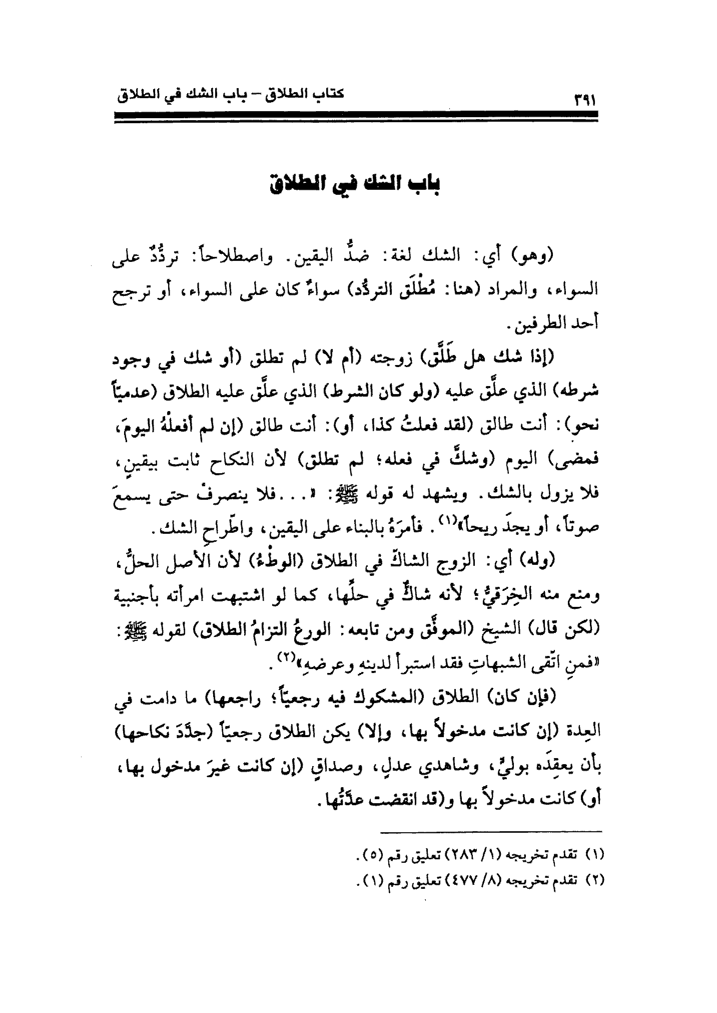 (إذا شك هل طَلَّق) زوجته (أم لا) لم تطلق (أو شك في وجود شرطه) الذي علَّق عليه (ولو كان الشرط) الذي علَّق عليه الطلاق (عدميًّا نحو): أنت طالق (لقد فعلتُ كذا، أو): أنت طالق (إن لم أفعلْهُ اليومَ، فمضى) اليوم (وشكَّ في فعله؛ لم تطلق) لأن النكاح ثابت بقينٍ، فلا يزول بالشك. ويشهد له قوله - صلى الله عليه وسلم -: " ... فلا ينصرفْ حتى يسمعَ صوتًا، أو يجدَ ريحًا" (¬١). فأمرَهُ بالبناء على اليقين، واطَّراحٍ الشك.