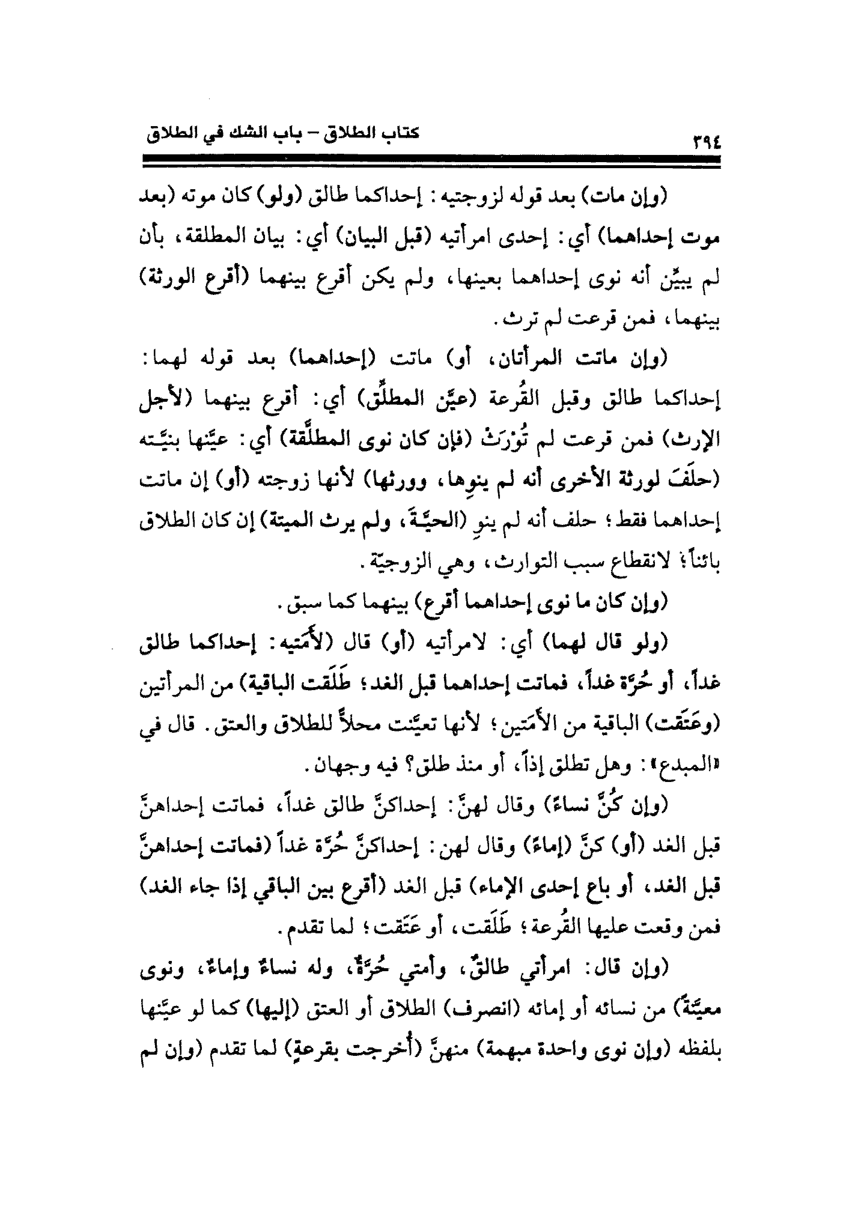 (وإن مات) بعد قوله لزوجتيه: إحداكما طالق (ولو) كان موته (بعد موت إحداهما) أي: إحدى امرأتيه (قبل البيان) أي: بيان المطلقة، بأن لم يبيِّن أنه نوى إحداهما بعينها، ولم يكن أقرع بينهما (أقرع الورثة) بينهما، فمن قرعت لم ترث.
