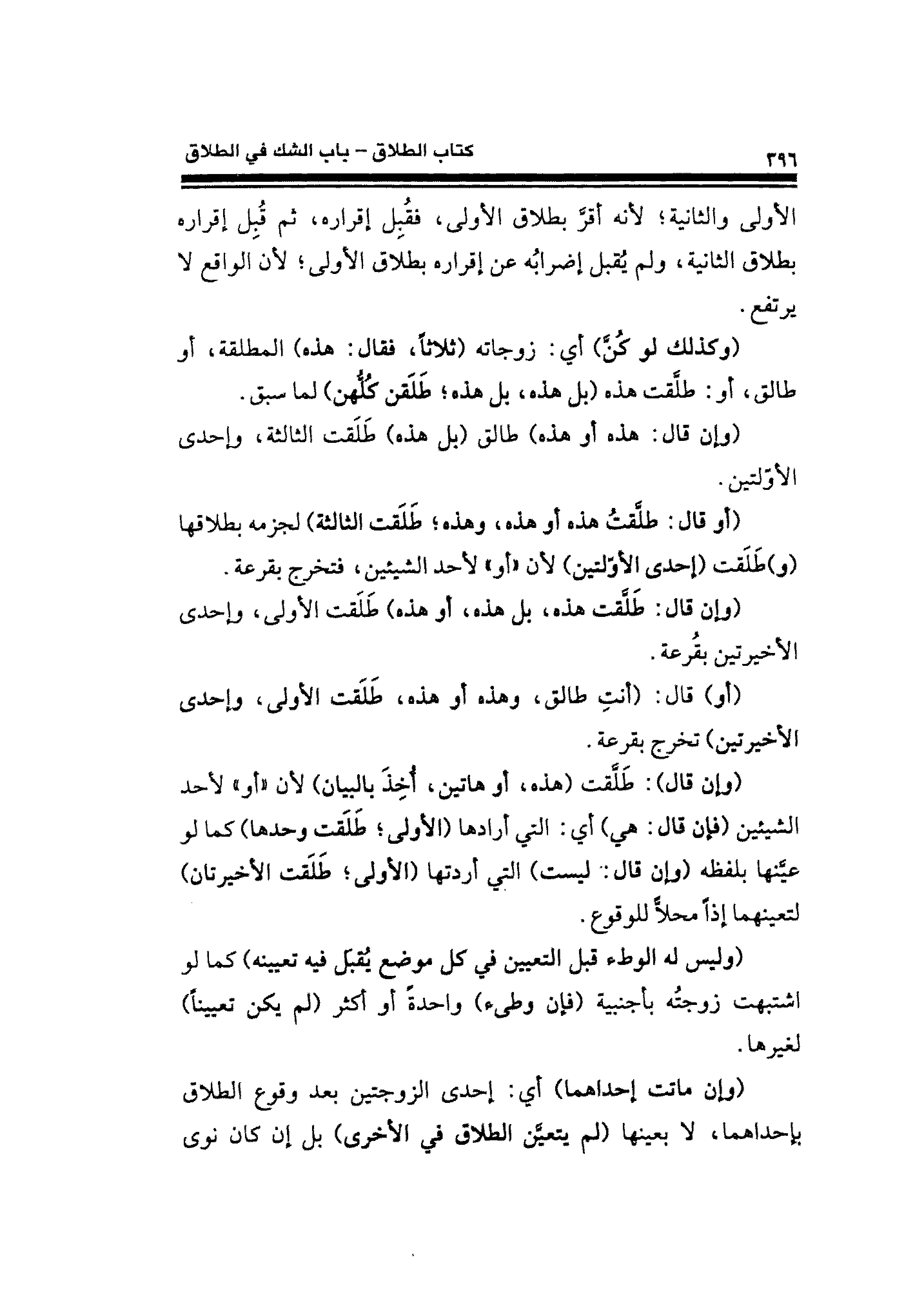 (أو) قال: (أنتِ طالق، وهده أو هذه، طَلَقت الأولى، وإحدى الأخيرتين) تخرج بقرعة.