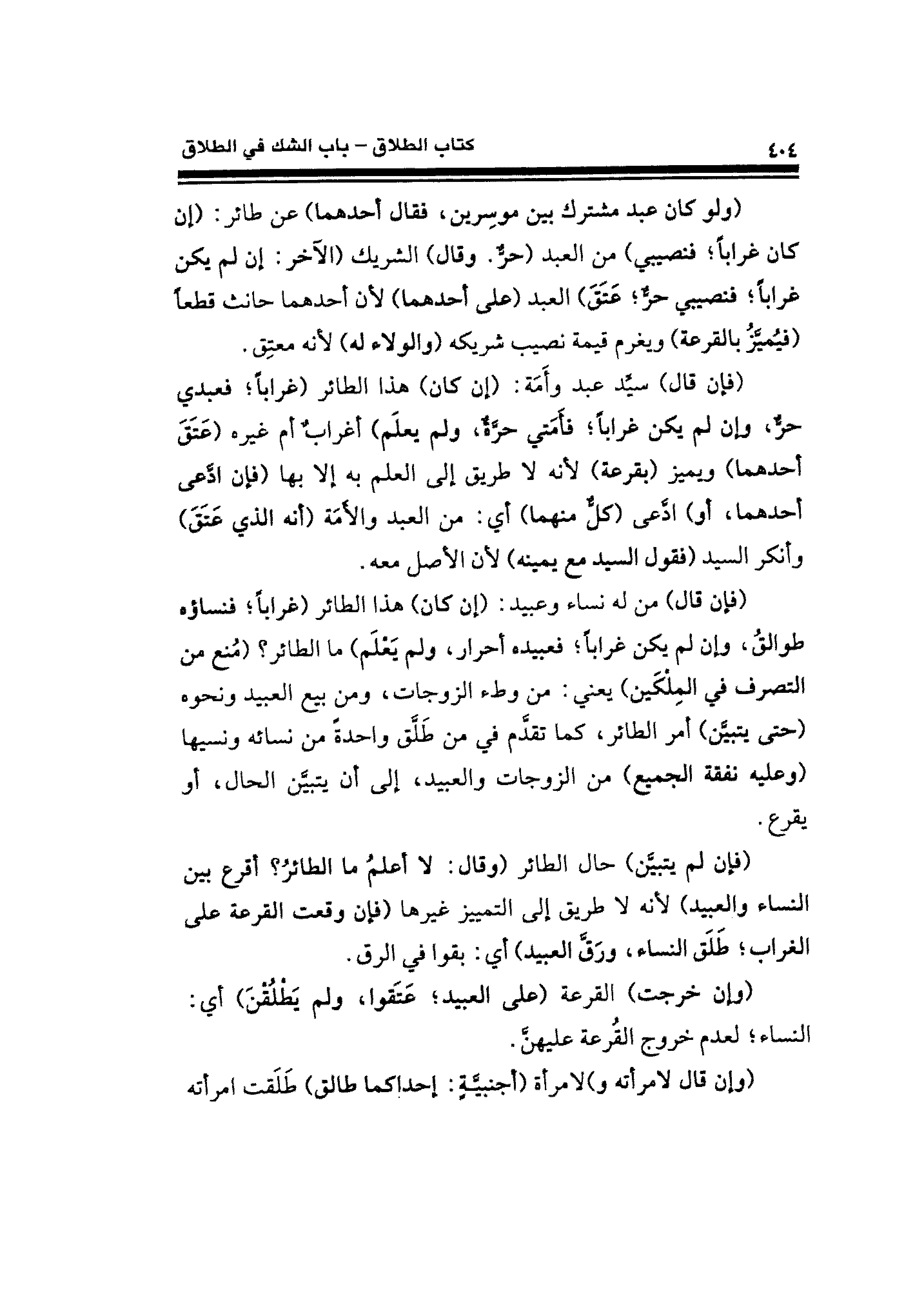 (فإن لم يتبيَّن) حال الطائر (وقال: لا أعلمُ ما الطائرُ؟ أقرع بين النساء والعبيد) لأنه لا طريق إلى التمييز غيرها (فإن وقعت القرعة على الغراب؛ طَلَق النساء، ورَقَّ العبيد) أي: بقوا في الرق.