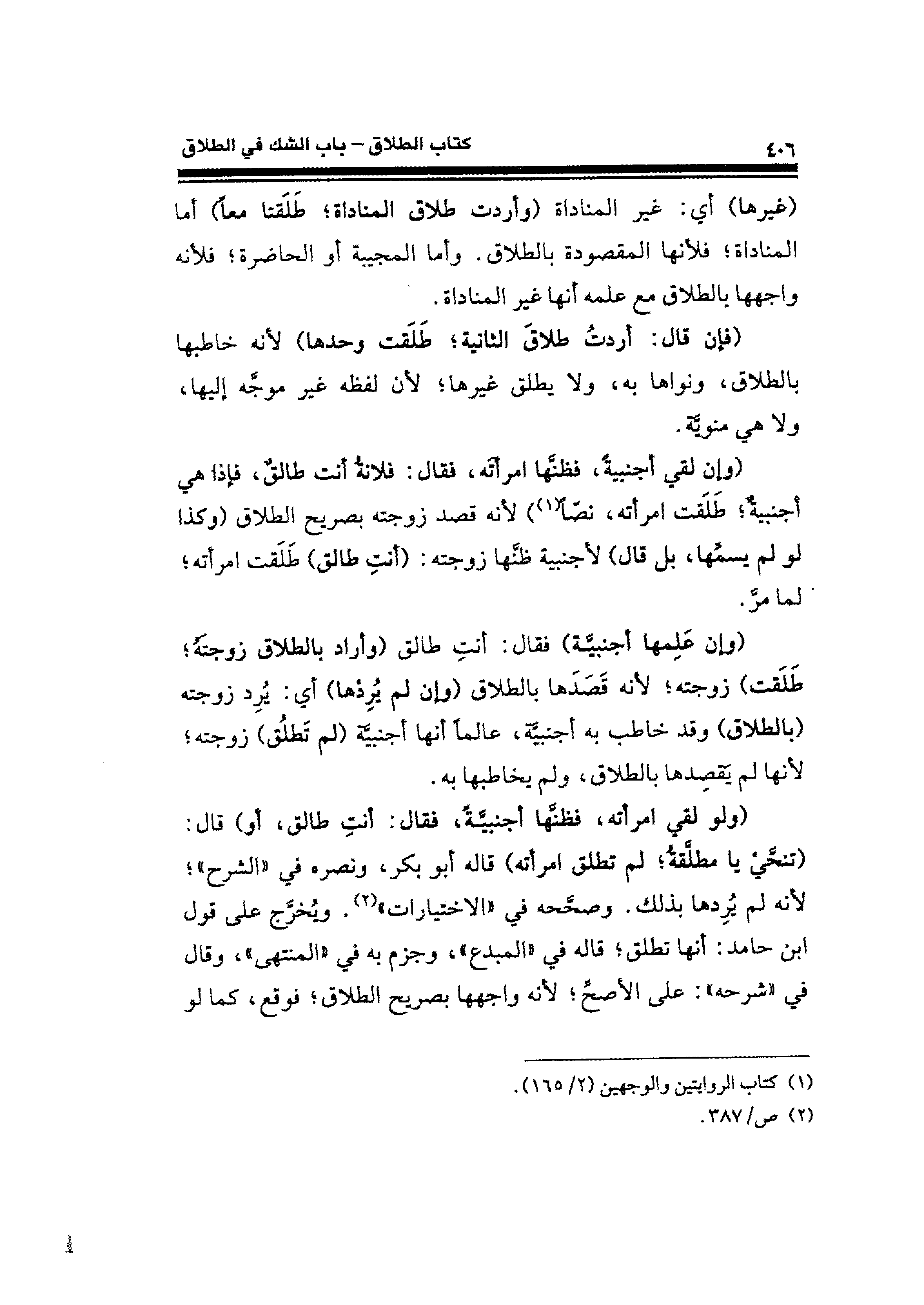(ولو لقي امرأته، فظنَّها أجنبيَّةٌ، فقال: أنتِ طالق، أو) قال: (تنحَّي يا مطلَّقةُ؛ لم تطلق امرأته) قاله أبو بكر، ونصره في "الشرح"؛ لأنه لم يُرِدها بذلك. وصحَّحه في "الاختيارات" (¬٢). ويُخرَّج على قول ابن حامد: أنها تطلق؛ قاله في "المبدع"، وجزم به في "المنتهى"، وقال في "شرحه": على الأصحِّ؛ لأنه واجهها بصريح الطلاق؛ فوقع، كما لو