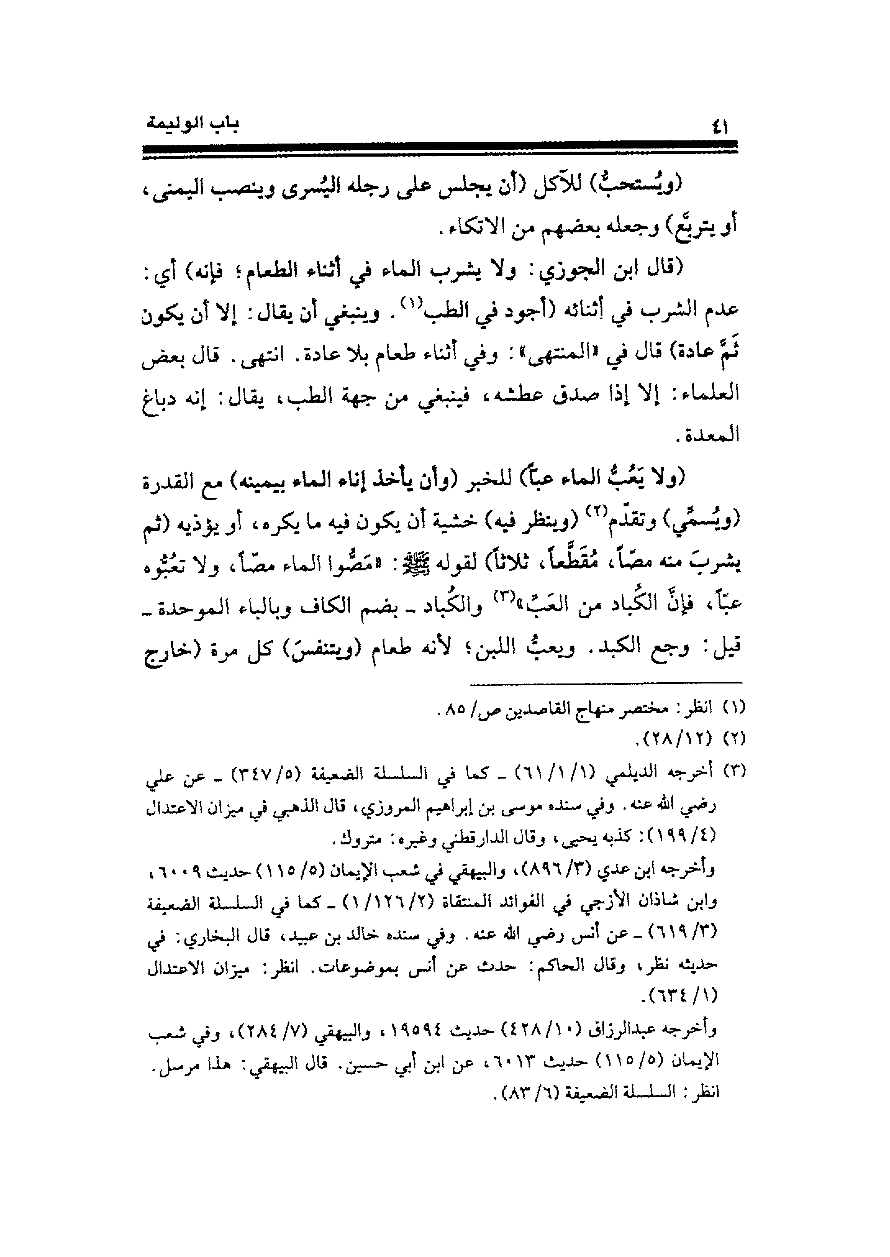 (قال ابن الجوزي: ولا يشرب الماء في أثناء الطعام؛ فإنه) أي: عدم الشرب في أثنائه (أجود في الطب (¬١). وينبغي أن يقال: إلا أن يكون ثَمَّ عادة) قال في "المنتهى": وفي أثناء طعام بلا عادة. انتهى. قال بعض العلماء: إلا إذا صدق عطشه، فينبغي من جهة الطب، يقال: إنه دباغ المعدة.