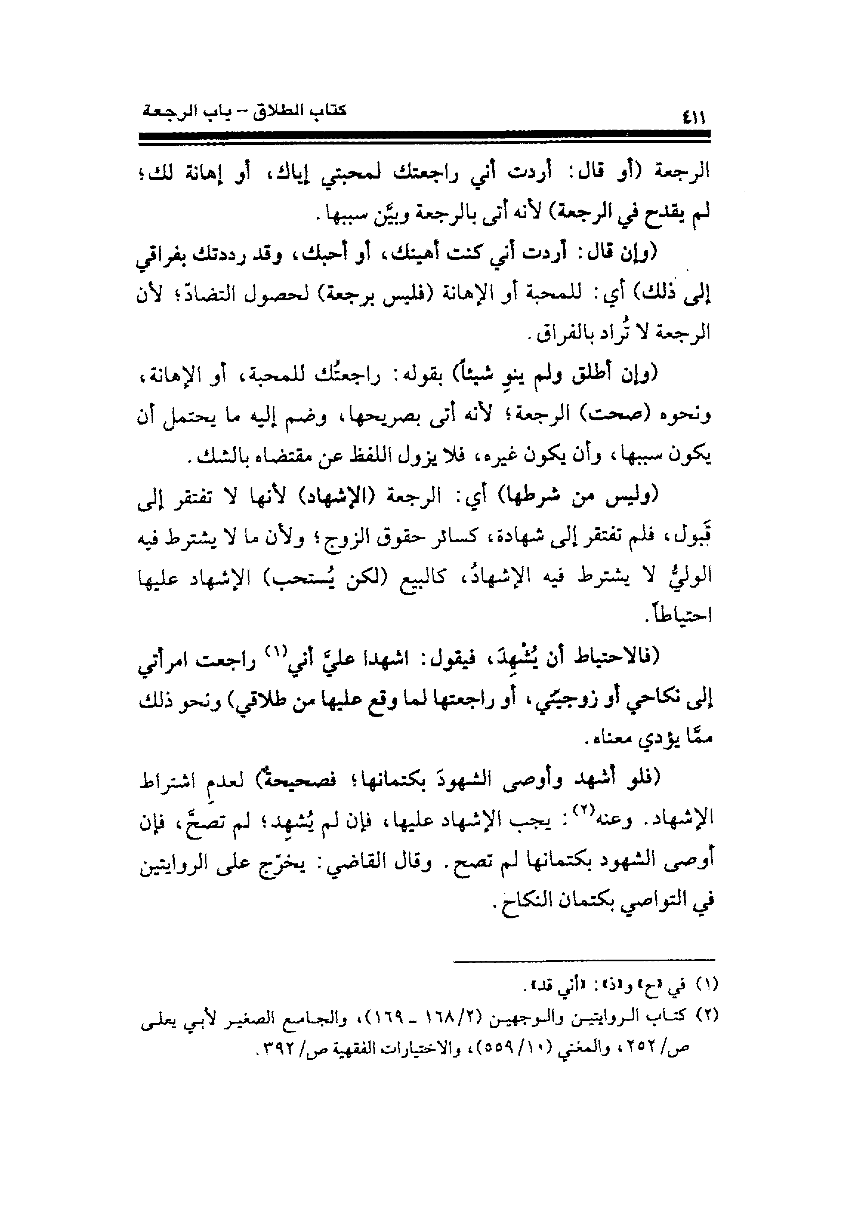 (وليس من شرطها) أي: الرجعة (الإشهاد) لأنها لا تفتقر إِلَى قَبول، فلم تفتقر إلى شهادة، كسائر حقوق الزوج؛ ولأن ما لا يشترط فيه الوليُّ لا يشترط فيه الإشهادُ، كالبيع (لكن يُستحب) الإشهاد عليها احتياطًا.