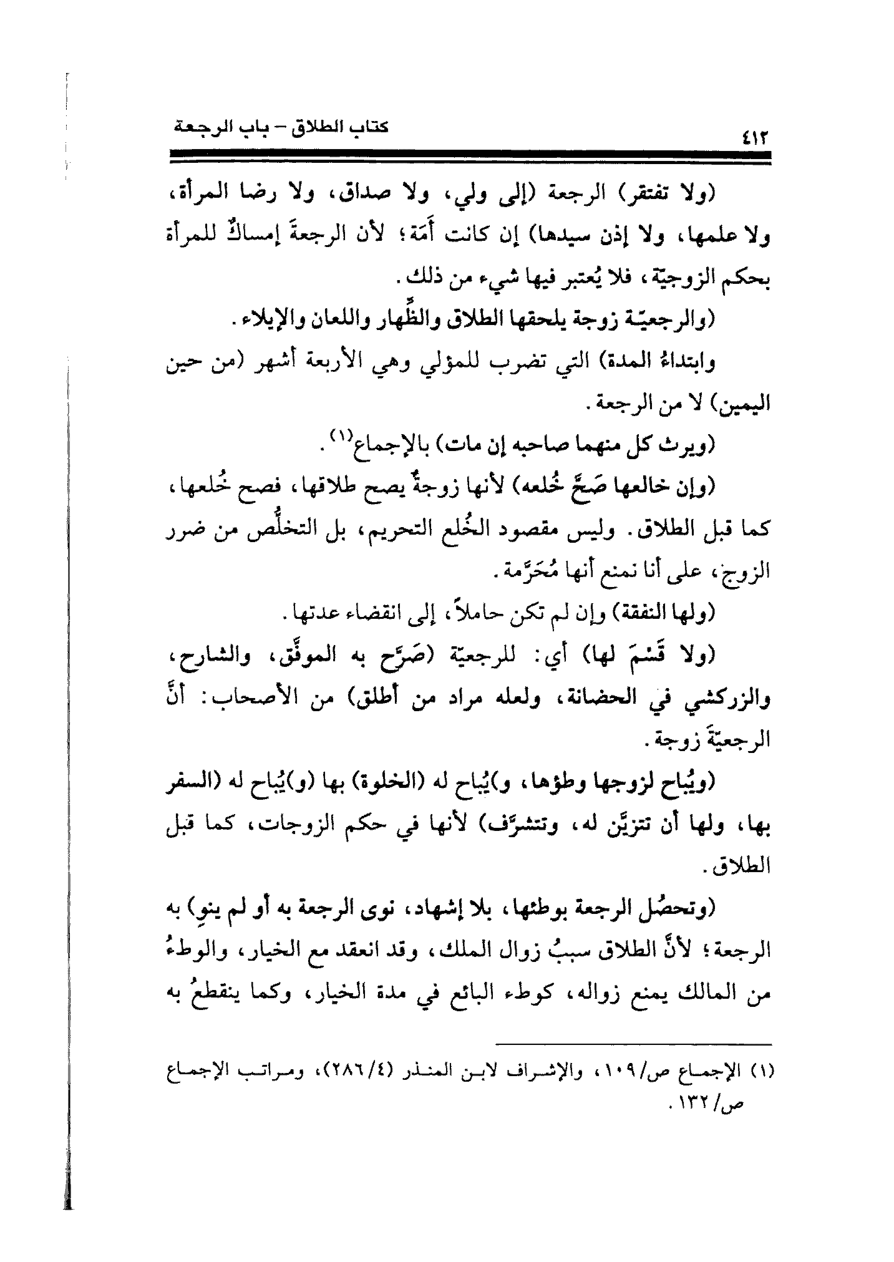 (ولا تفتقر) الرجعة (إِلَى ولي، ولا صداق، ولا رضا المرأة، ولا علمها، ولا إذن سيدها) إن كانت أَمَة؛ لأن الرجعةَ إمساكٌ للمرأة بحكم الزوجيَّة، فلا يُعتبر فيها شيء من ذلك.