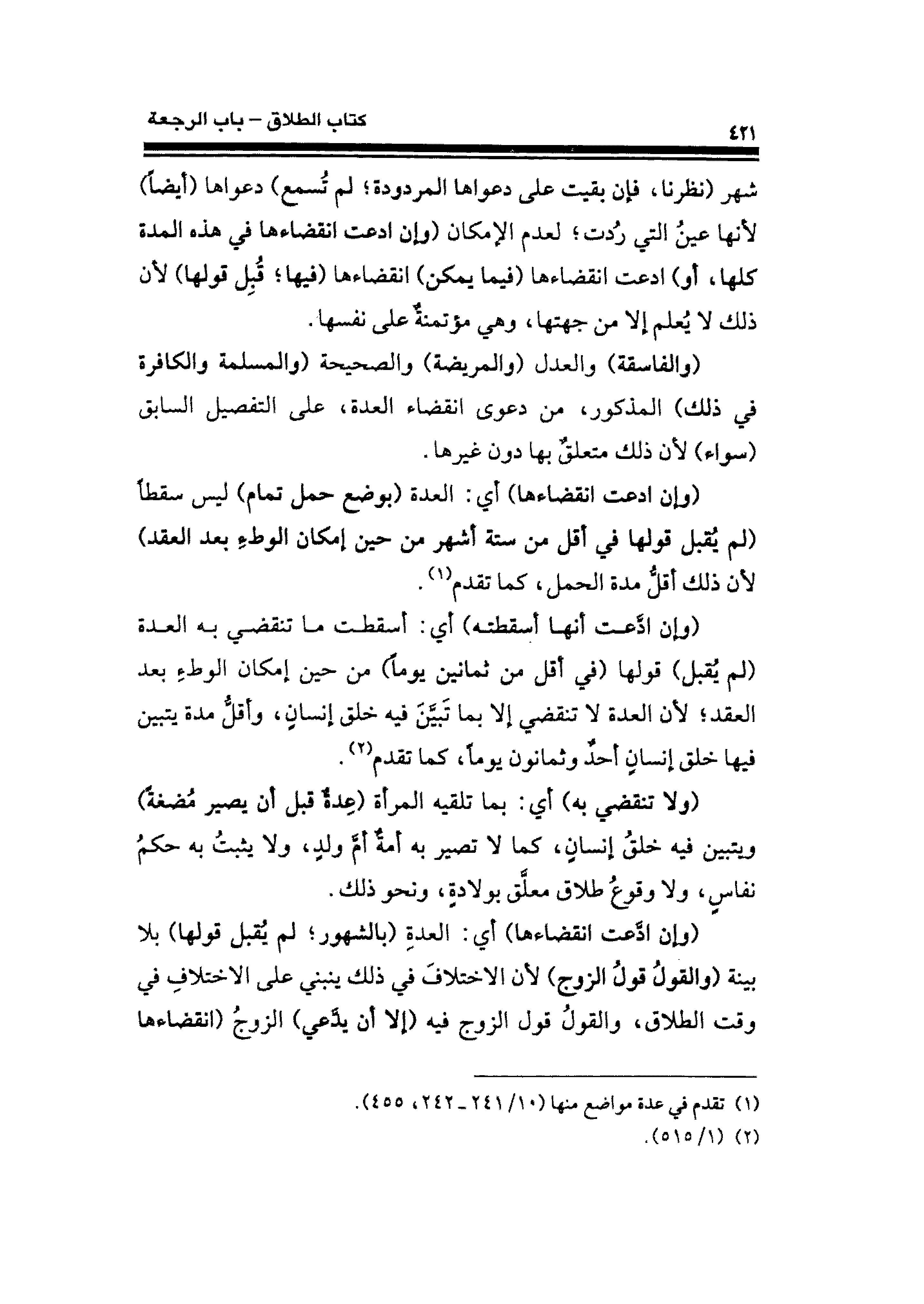 شهر (نظرنا، فإن بقيت على دعواها المردودة؛ لم تُسمع) دعواها (أَيضًا) لأنها عينُ التي رُدت؛ لعدم الإمكان (وإن ادعت انقضاءها في هذه المدة كلها، أو) ادعت انقضاءها (فيما يمكن) انقضاءها (فيها؛ قُبِل قولها) لأن ذلك لا يُعلم إلَّا من جهتها، وهي مؤتمنةٌ على نفسها.