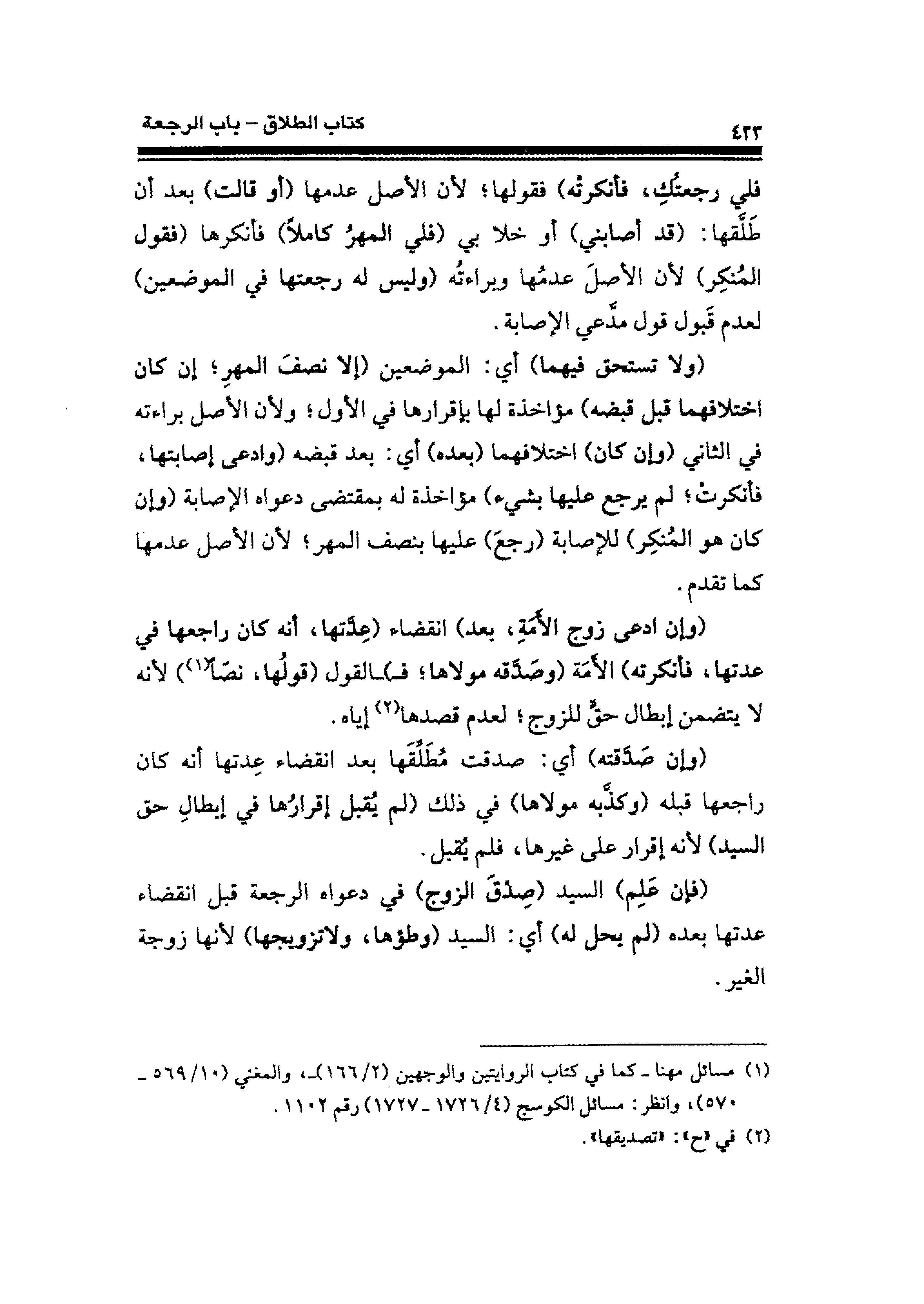 فلي رجعتُكِ، فأنكرتْه) فقولها؛ لأن الأصل عدمها (أو قالت) بعد أن طَلَّقها: (قد أصابني) أو خلا بي (فلي المهرُ كاملًا) فأنكرها (فقول المُنكِر) لأن الأصلَ عدمُها وبراءتُه (وليس له رجعتها في الموضعين) لعدم قَبول قول مدَّعى الإصابة.