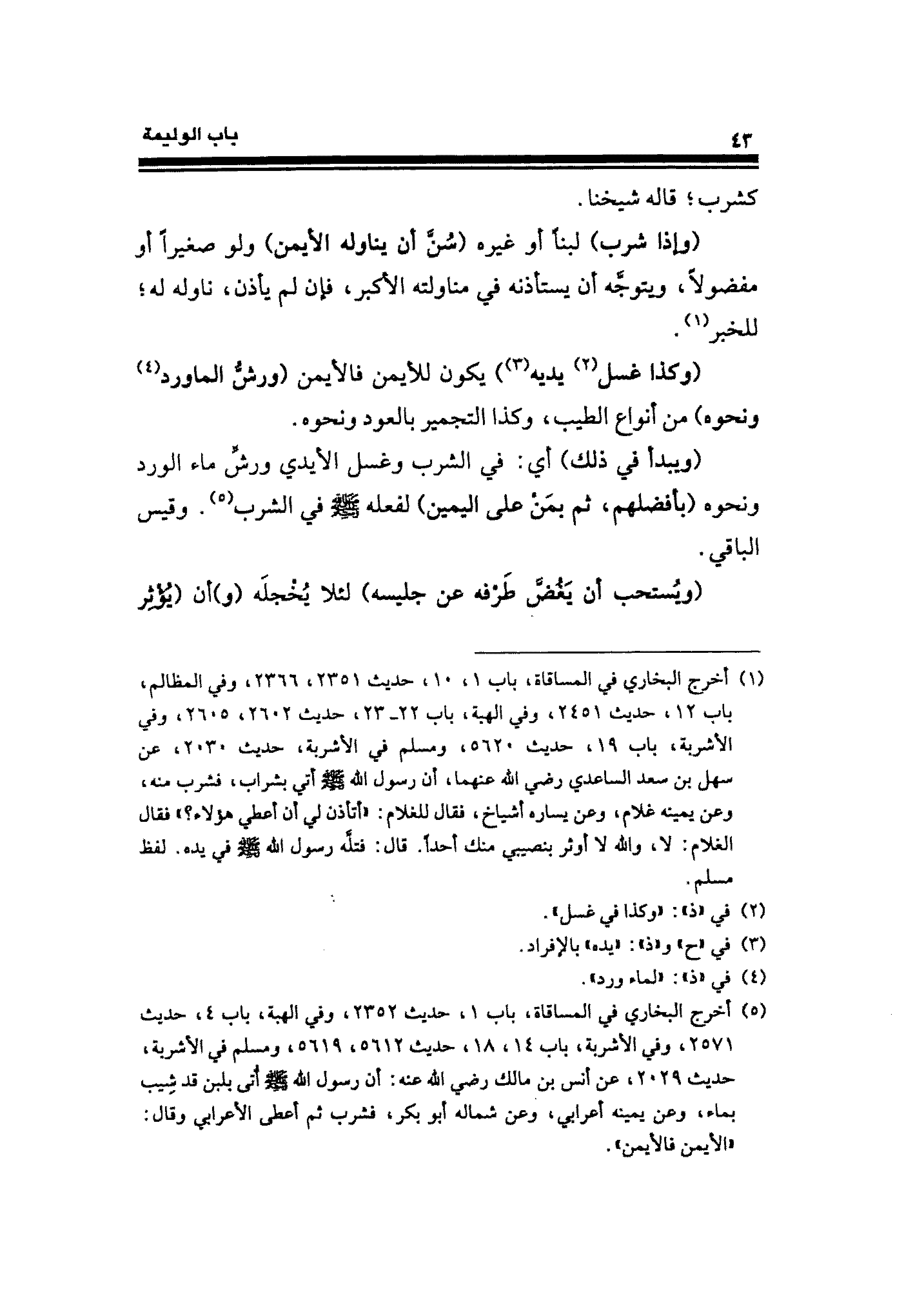 (¬٥) أخرج البخاري في المساقاة، باب ١، حديث ٢٣٥٢، وفي الهبة، باب ٤، حديث ٢٥٧١، وفي الأشربة، باب ١٤، ١٨، حديث ٥٦١٢، ٥٦١٩ ومسلم في الأشربة، حديث ٢٠٢٩، عن أنس بن مالك - رضي الله عنه -: أن رسول - صلى الله عليه وسلم - أتى بلبن قد شِيب بماء، وعن يمينه أعرابي، وعن شماله أبو بكر، فشرب ثم أعطى الأعرابي وقال: "الأيمن فالأيمن".