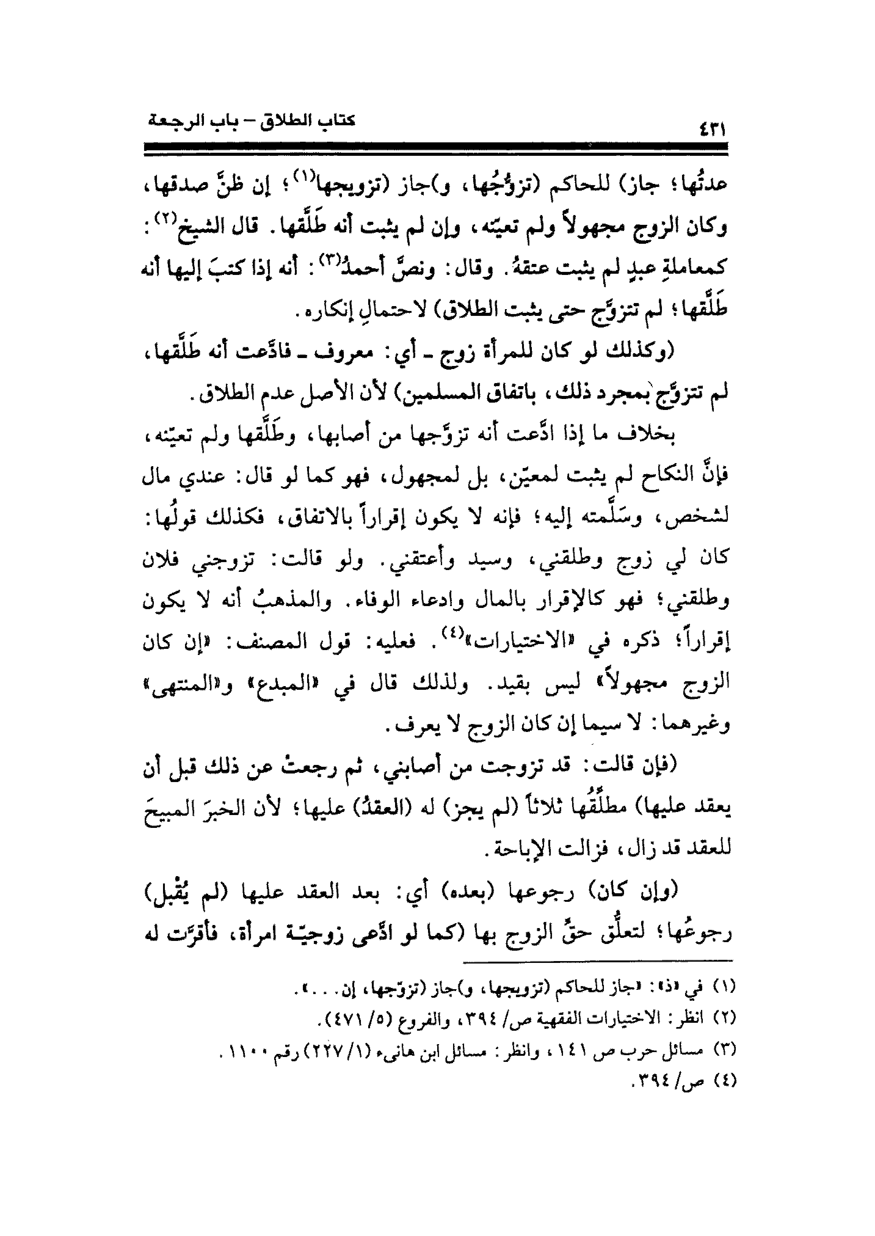 بخلاف ما إذا ادَّعت أنه تزوَّجها من أصابها، وطَلَّقها ولم تعيّنه، فإنَّ النكاح لم يثبت لمعيّن، بل لمجهول، فهو كما لو قال: عندي مال لشخص، وسلَّمته إليه؛ فإنه لا يكون إقرارًا بالاتفاق، فكذلك قولُها: كان لي زوج وطلقني، وسيد وأعتقني. ولو قالت: تزوجني فلان وطلقني؛ فهو كالإقرار بالمال وادعاء الوفاء. والمذهبُ أنه لا يكون إقرارًا؛ ذكره في "الاختيارات" (¬٤). فعليه: قول المصنف: (إن كان الزوج مجهولًا)، ليىس بقيد. ولذلك قال في "المبدع " و "المنتهى" وغيرهما: لا سيما إن كان الزوج لا يعرف.