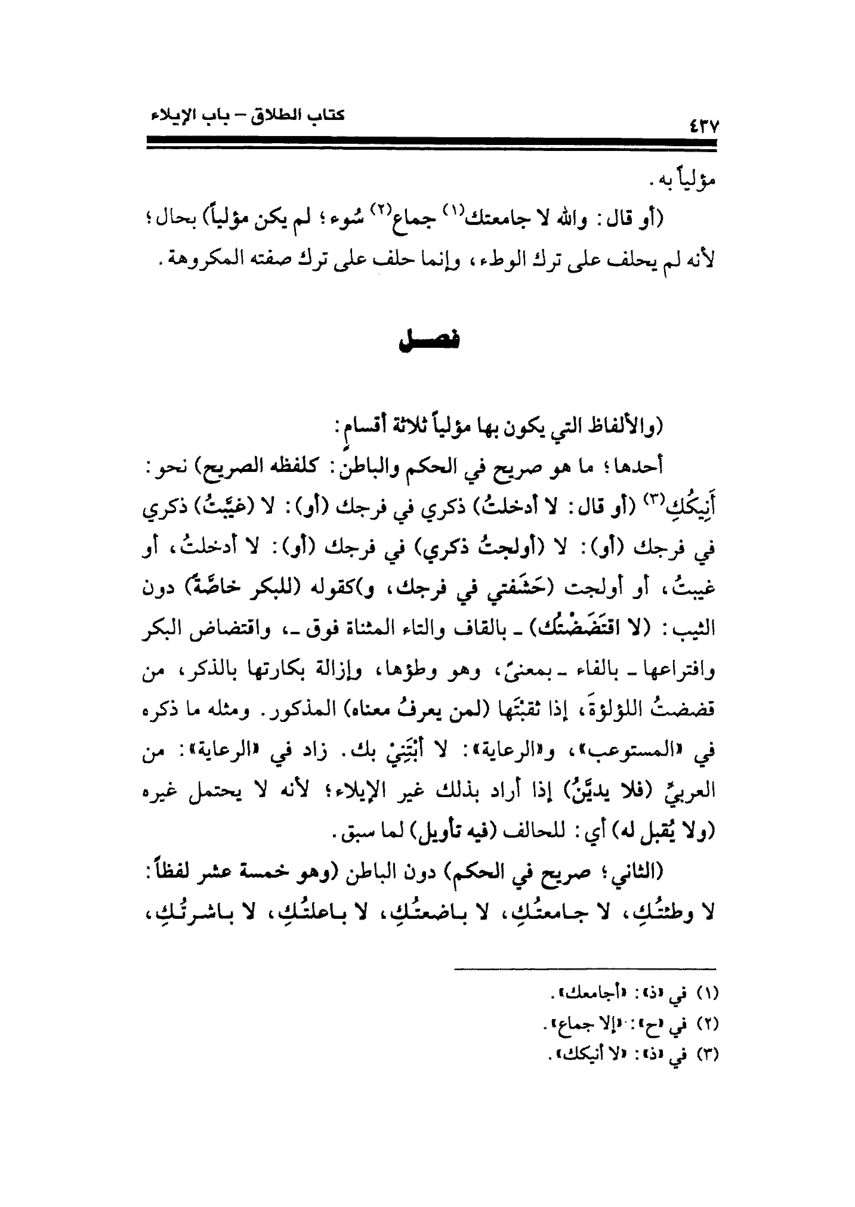 أحدها؛ ما هو صريح في الحكم والباطن: كلفظه الصريح) نحو: أَنِيكُكِ (¬٣) (أو قال: لا أدخلتُ) ذكري في فرجك (أو): لا (غيَّبتُ) ذكري في فرجك (أو): لا (أولجتُ ذكري) في فرجك (أو): لا أدخلتُ، أو غيبتُ، أو أولجت (حَشَفتي في فرجك، و) كقوله (للبكر خاصَّةً) دون الثيب: (لا اقتَضَضْتُك) -بالقاف والتاء المثناة فوق-، واقتضاض البكر وافتراعها -بالفاء- بمعنىً، وهو وطؤها، وإزالة بكارتها بالذكر، من قضضتُ اللؤلؤةَ، إذا ثقبْتَه (لمن يعرفُ معناه) المذكور. ومثله ما ذكره في "المستوعب"، و "الرعاية": لا أبْتَنِي بك. زاد في "الرعاية": من العربيِّ (فلا يديَّنُ) إذا أراد بذلك غير الإيلاء؛ لأنه لا يحتمل غيره (ولا يُقبل له) أي: للحالف (فيه تأويل) لما سبق.