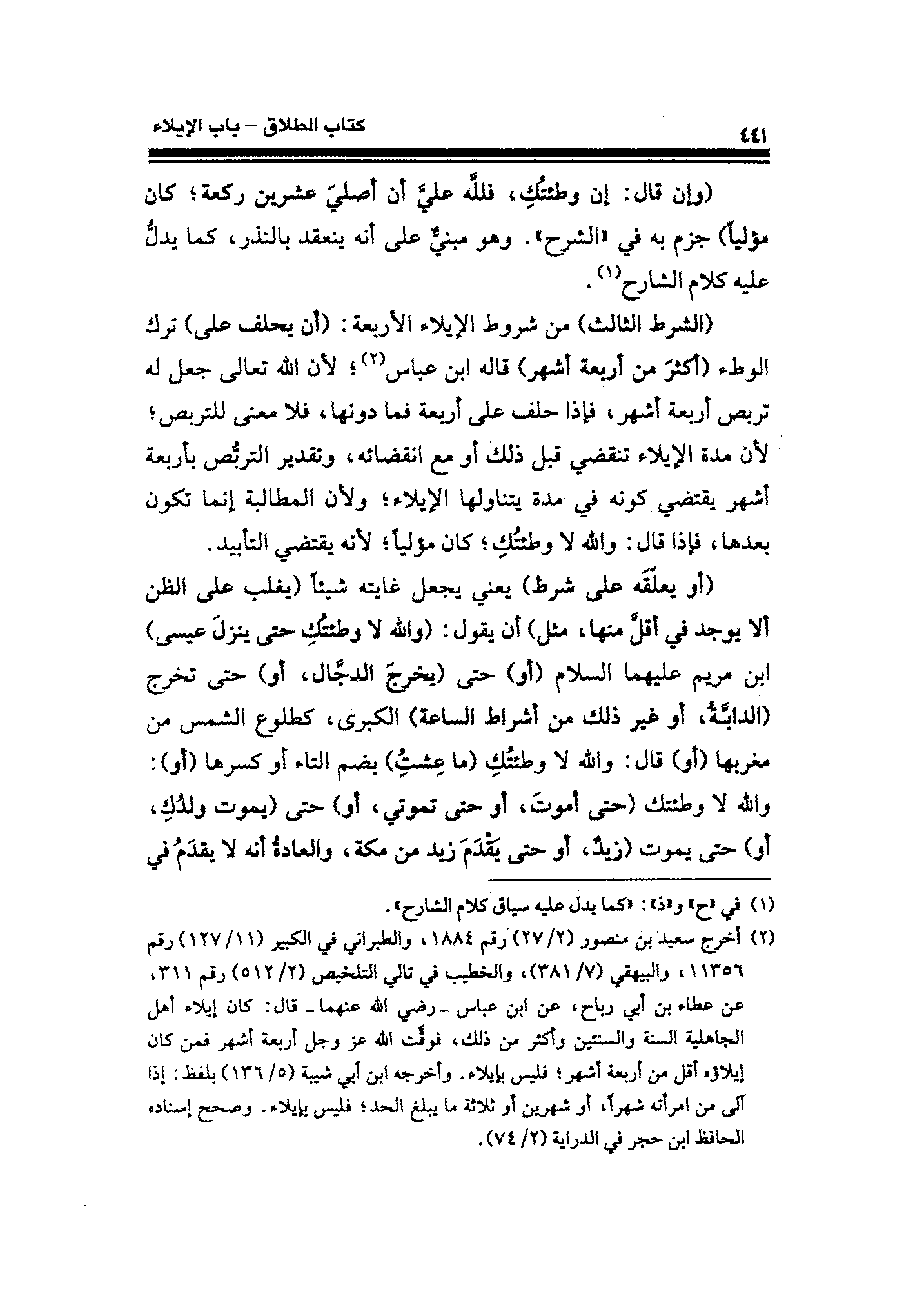 (¬٢) أخرج سعيد بن منصور (٢/ ٢٧) رقم ١٨٨٤، والطبراني في الكبير (١١/ ١٢٧) رقم ١١٣٥٦، والبيهقي (٧/ ٣٨١)، والخطيب في تالي التلخيص (٢/ ٥١٢) رقم ٣١١، عن عطاء بن أبي رباح، عن ابن عباس - رضي الله عنهما - قال: كان إيلاء أهل الجاهلية السنة والسنتين وأكثر من ذلك، فوقَّت الله عزَّ وجلَّ أربعة أشهر فمن كان إيلاؤه أقل من أربعة أشهر؛ فليس بإيلاء. وأخرجه ابن أبي شيبة (٥/ ١٣٦) بلفظ: إذا آلى من امرأته شهرًا، أو شهرين أو ثلاثة ما يبلغ الحد؛ فليس بإيلاء. وصحح إسناده الحافظ ابن حجر في الدراية (٢/ ٧٤).
