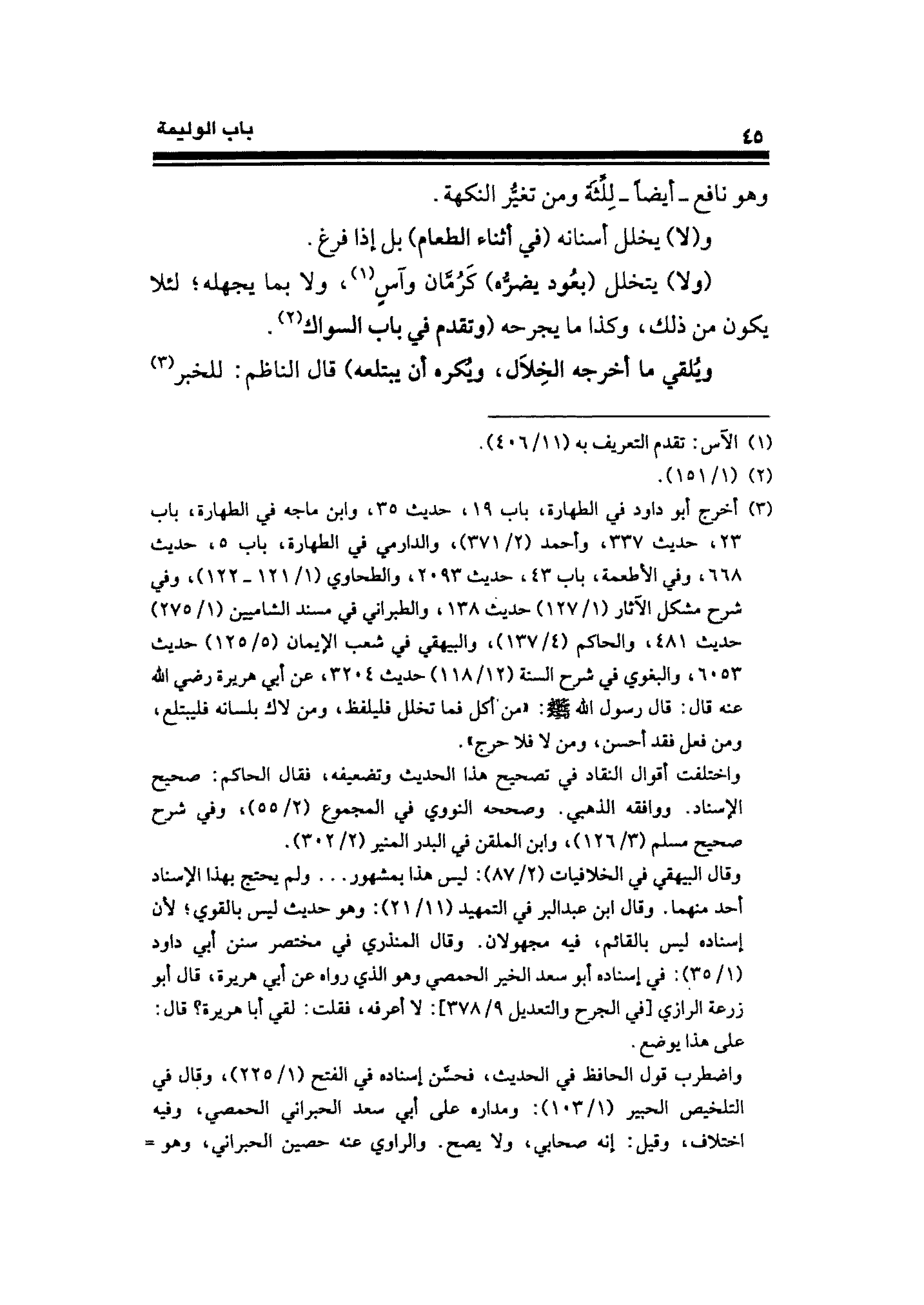 (¬٣) أخرج أبو داود في الطهارة، باب ١٩، حديث ٣٥، وابن ماجه في الطهارة، باب ٢٣، حديث ٣٣٧، وأحمد (٢/ ٣٧١)، والدارمي في الطهارة، باب ٥، حديث ٦٦٨، وفي الأطعمة، باب ٤٣، حديث ٢٠٩٣، والطحاوي (١/ ١٢١ - ١٢٢)، وفي شرح مشكل الآثار (١/ ١٢٧) حديث ١٣٨، والطبراني في مسند الشاميين (١/ ٢٧٥) حديث ٤٨١، والحاكم (٤/ ١٣٧)، والبيهقي في شعب الإيمان (٥/ ١٢٥) حديث ٦٠٥٣، والبغوي في شرح السنة (١٢/ ١١٨) حديث ٣٢٠٤، عن أبي هريرة - رضي الله عنه - قال: قال رسول الله - صلى الله عليه وسلم -: "من أكل فما تخلل فليلفظ، ومن لاك بلسانه فليبتلع، ومن فعل فقد أحسن، ومن لا فلا حرج".