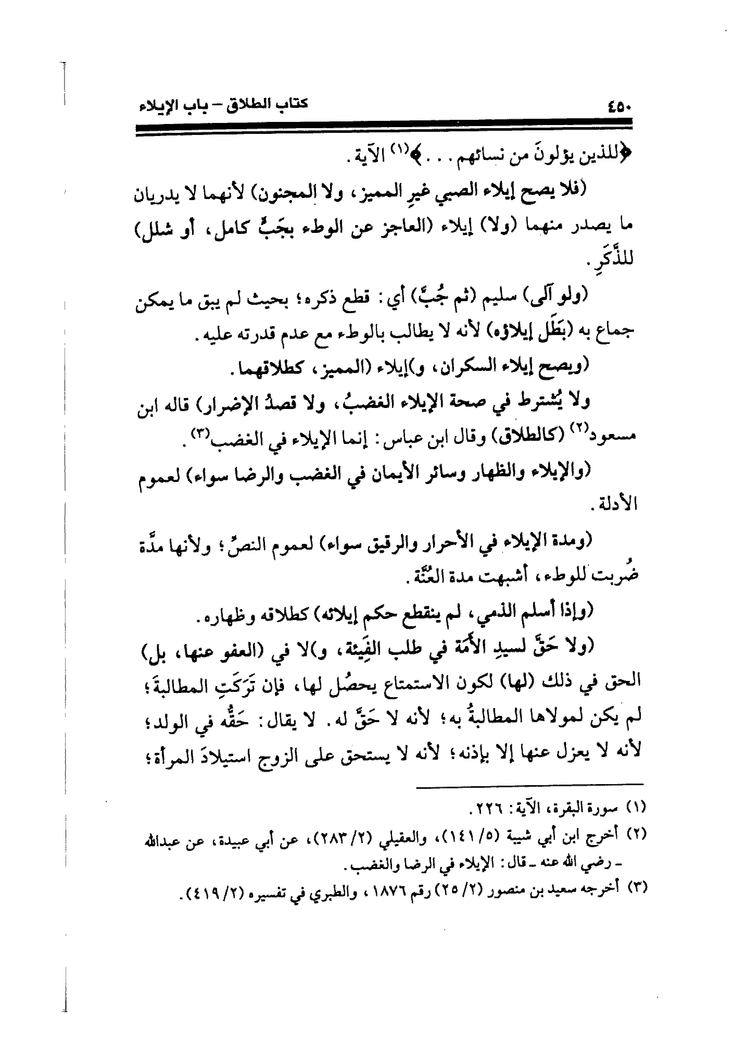 (¬٢) أخرج ابن أبي شيبة (٥/ ١٤١)، والعقيلي (٢/ ٢٨٣)، عن أبي عبيدة، عن عبد الله - رضي الله عنه - قال: الإيلاء في الرضا والغضب.