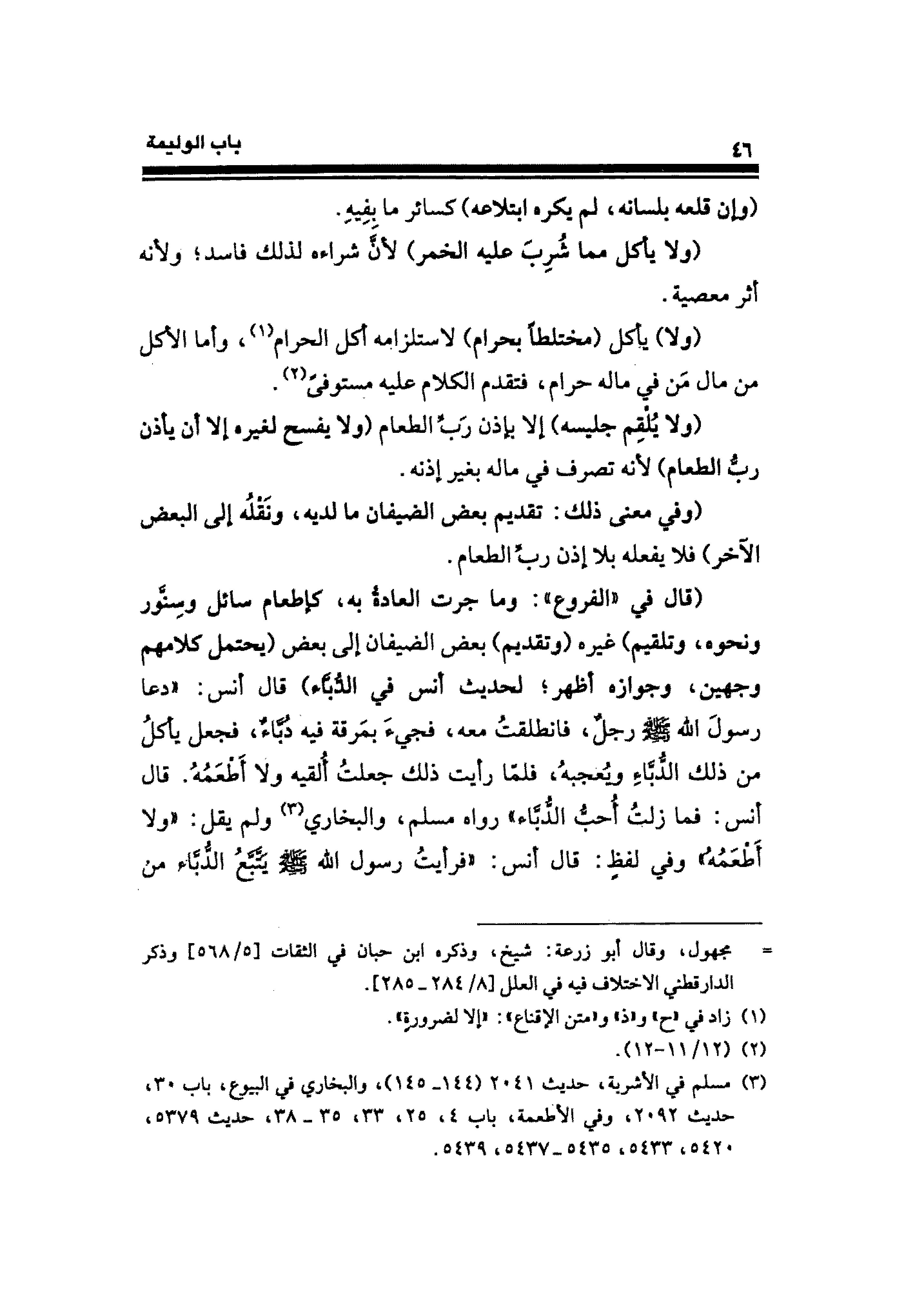 (¬٣) مسلم في الأشربة، حديث ٢٠٤١ (١٤٤ - ١٤٥)، والبخاري في البيوع، باب ٣٠، حديث ٢٠٩٢، وفي الأطعمة، باب ٤، ٢٥، ٣٣، ٣٥ - ٣٨، حديث ٥٣٧٩، ٥٤٢٠، ٥٤٣٣، ٥٤٣٥ - ٥٤٣٧، ٥٤٣٩.