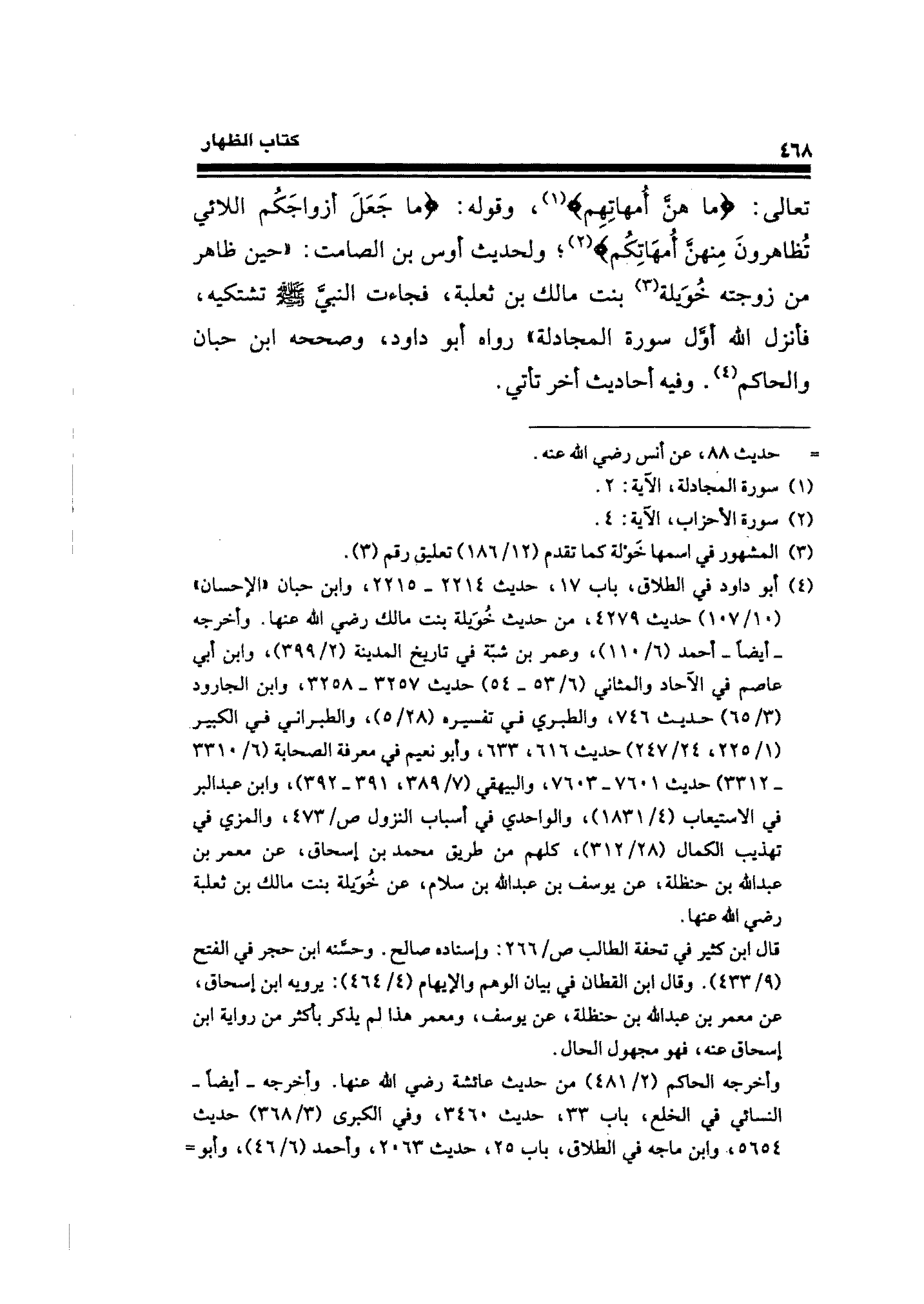 (¬٤) أبو داود في الطلاق، باب ١٧، حديث ٢٢١٤ - ٢٢١٥، وابن حبان "الإحسان" (١٠/ ١٠٧) حديث ٤٢٧٩، من حديث خُوَيلة بنت مالك رضي الله عنها. وأخرجه -أيضًا- أحمد (٦/ ١١٠)، وعمر بن شبة في تاريخ المدينة (٢/ ٣٩٩)، وابن أبي عاصم في الآحاد والمثاني (٦/ ٥٣ - ٥٤) حديث ٣٢٥٧ - ٣٢٥٨، وابن الجارود (٣/ ٦٥) حديث ٧٤٦، والطبري في تفسيره (٢٨/ ٥)، والطبراني في الكبير (١/ ٢٢٥، ٢٤/ ٢٤٧) حديث ٦١٦، ٦٣٣ وأبو نعيم في معرفة الصحابة (٦/ ٣٣١٠ - ٣٣١٢) حديث ٧٦٠١ - ٧٦٠٣، والبيهقي (٧/ ٣٨٩، ٣٩١ - ٣٩٢)، وابن عبد البر في الاستيعاب (٤/ ١٨٣١)، والواحدي في أسباب النزول ص / ٤٧٣، والمزي في تهذيب الكمال (٢٨/ ٣١٢)، كلهم من طريق محمد بن إسحاق، عن معمر بن عبد الله بن حنظلة، عن يوسف بن عبد الله بن سلام، عن خُوَيلة بنت مالك بن ثعلبة رضي الله عنها.