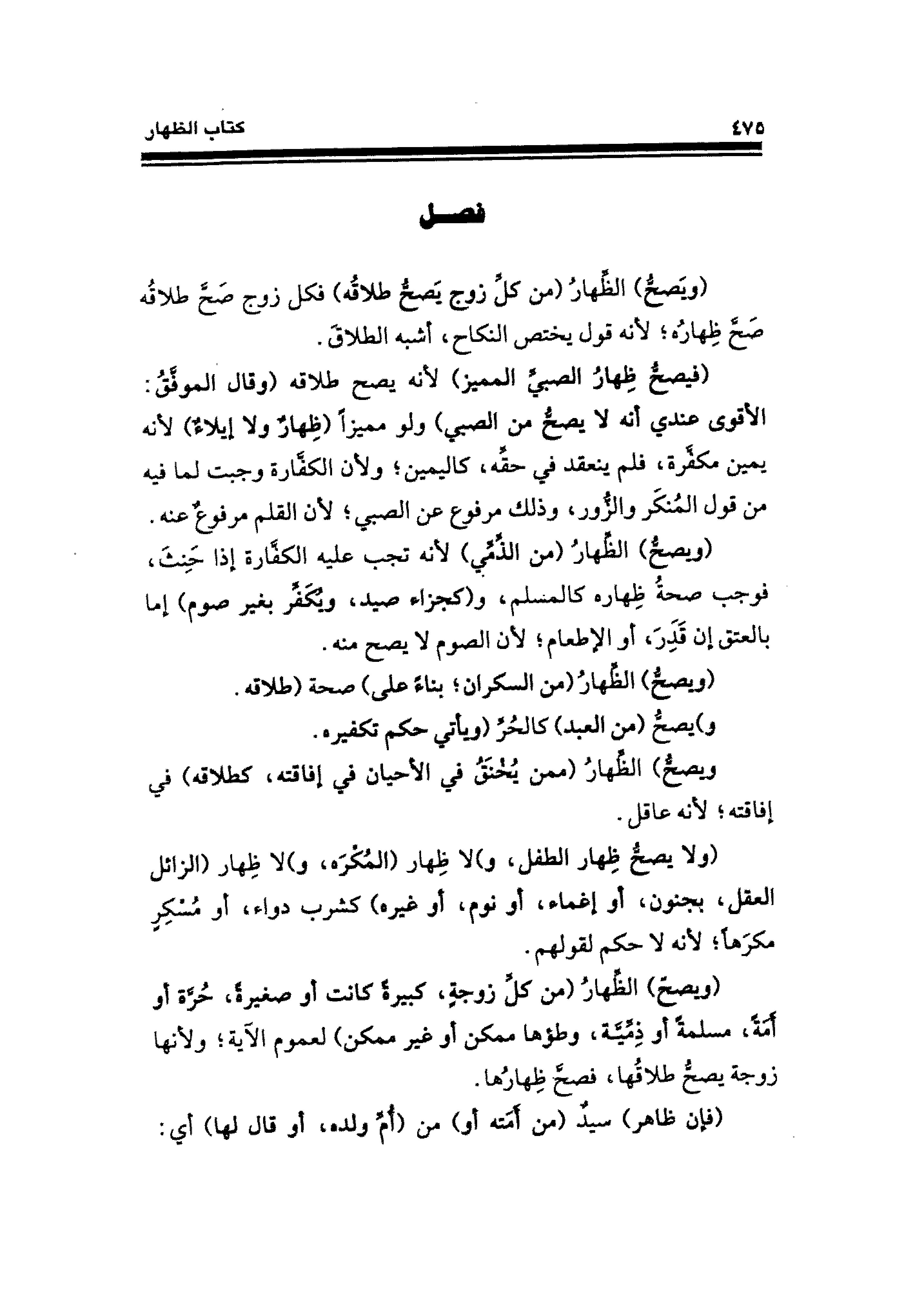 (فيصحُّ ظِهارُ الصبيِّ المميز) لأنه يصح طلاقه (وقال الموفَّقُ: الأقوى عندي أنه لا يصحُّ من الصبي) ولو مميزًا (ظِهارٌ ولا إيلاءٌ) لأنه يمين مكفَّرة، فلم ينعقد في حقِّه، كاليمين؛ ولأن الكفَّارة وجبت لما فيه من قول المُنكَر والزُّور، وذلك مرفوع عن الصبي؛ لأن القلم مرفوعٌ عنه.