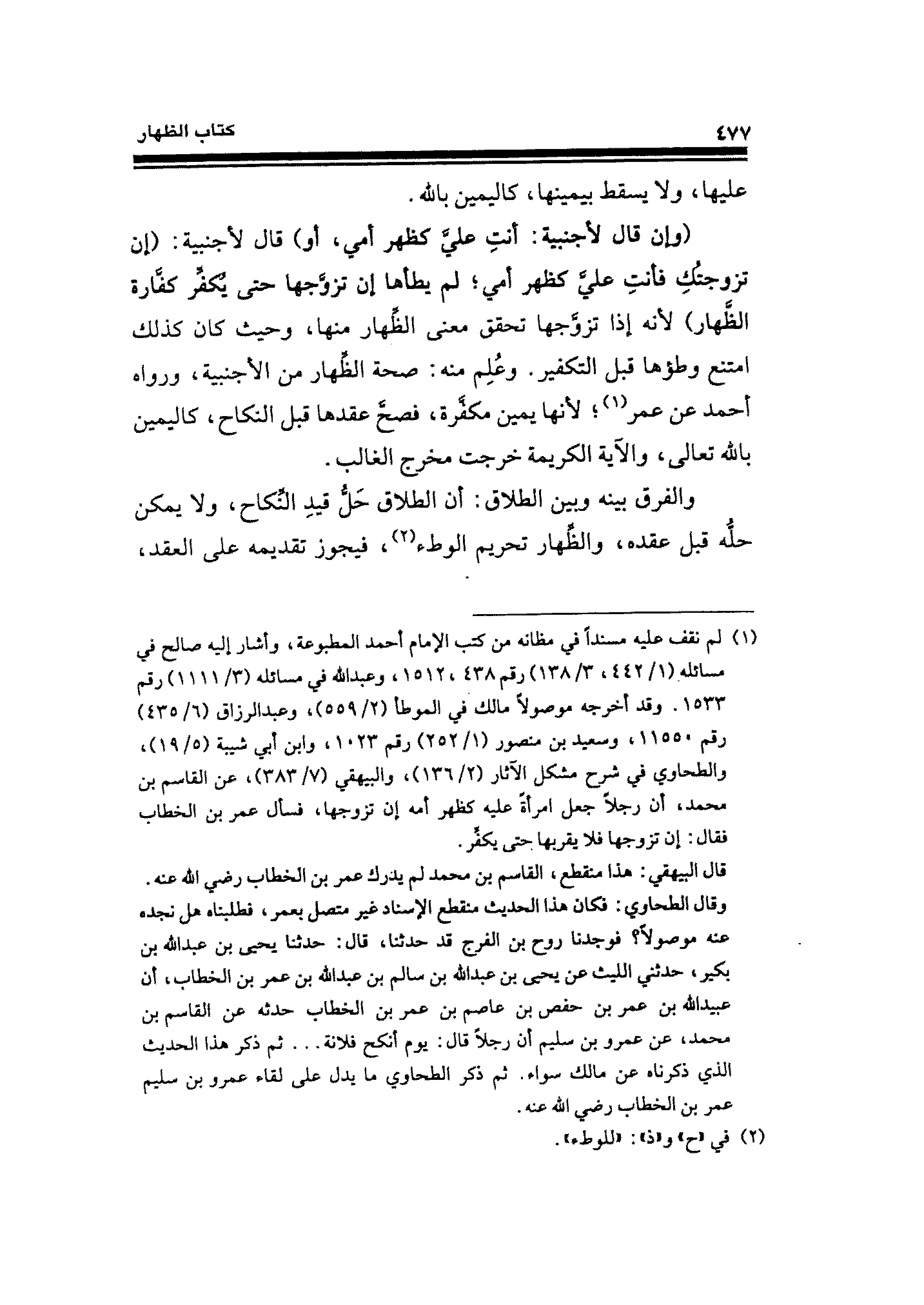 (¬١) لم نقف عليه مسندًا في مظانه من كتب الإمام أحمد المطبوعة، وأشار إليه صالح في مسائله (١/ ٤٤٢، ٣/ ١٣٨) رقم ٤٣٨، ١٥١٢، وعبد الله في مسائله (٣/ ١١١١) رقم ١٥٣٣. وقد أخرجه موصولًا مالك في الموطأ (٢/ ٥٥٩)، وعبد الرزاق (٦/ ٤٣٥) رقم ١١٥٥٠ وسعيد بن منصور (١/ ٢٥٢) رقم ١٠٢٣، وابن أبي شيبة (٥/ ١٩)، والطحاوي في شرح مشكل الآثار (٢/ ١٣٦)، والبيهقي (٧/ ٣٨٣)، عن القاسم بن محمد، أن رجلًا جعل امرأةً عليه كظهر أمه إن تزوجها، فسأل عمر بن الخطاب فقال: إن تزوجها فلا يقربها حتى يكفِّر.