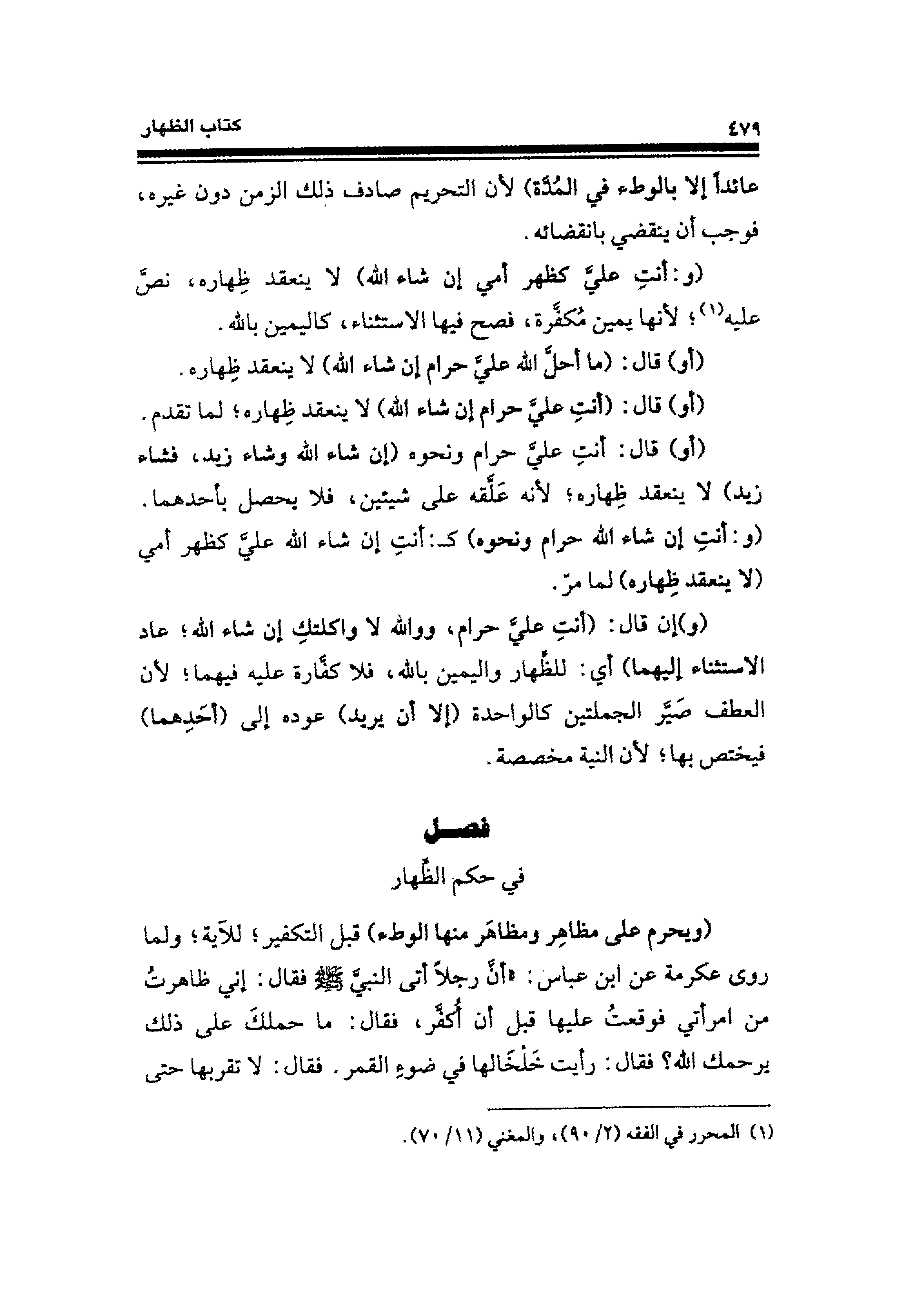 (و) إن قال: (أنتِ عليَّ حرام، ووالله لا واكلتكِ إن شاء الله؛ عاد الاستثناء إليهما) أي: للظِّهار واليمين بالله، فلا كفَّارة عليه فيهما؛ لأنَّ العطف صَيَّر الجملتين كالواحدة (إلا أن يريد) عوده إلى (أحَدِهما) فيختص بها؛ لأنَّ النية مخصصة.