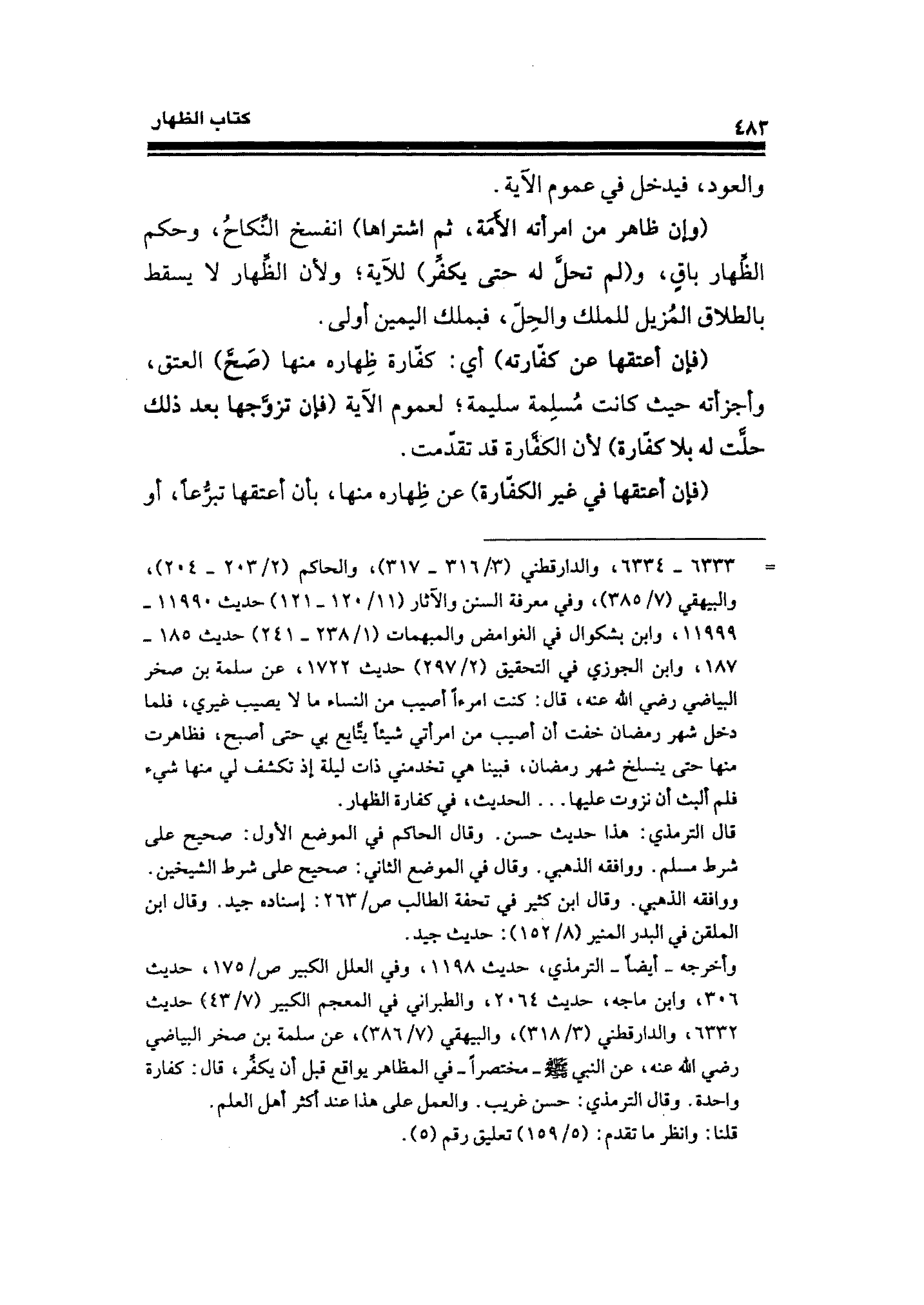 = ٦٣٣٣ - ٦٣٣٤، والدارقطني (٣/ ٣١٦ - ٣١٧)، والحاكم (٢/ ٢٠٣ - ٢٠٤)، والبيهقي (٧/ ٣٨٥)، وفي معرفة السنن والآثار (١١/ ١٢٠ - ١٢١) حديث ١١٩٩٠ - ١١٩٩٩، وابن بشكوال في الغوامض والمبهمات (١/ ٢٣٨ - ٢٤١) حديث ١٨٥ - ١٨٧، وابن الجوزي في التحقيق (٢/ ٢٩٧) حديث ١٧٢٢، عن سلمة بن صخر البياضي - رضي الله عنه -، قال: كنت امرءًا أصيب من النساء ما لا يصيب غيري، فلما دخل شهر رمضان خفت أن أصيب من امرأتي شيئًا يُتَابَع بي حتى أصبح، فظاهرت منها حتى ينسلخ شهر رمضان، فبينما هي تخدمني ذات ليلة إذ تكشف لي منها شيء فلم ألبث أن نزوت عليها. . . الحديث، في كفارة الظهار.