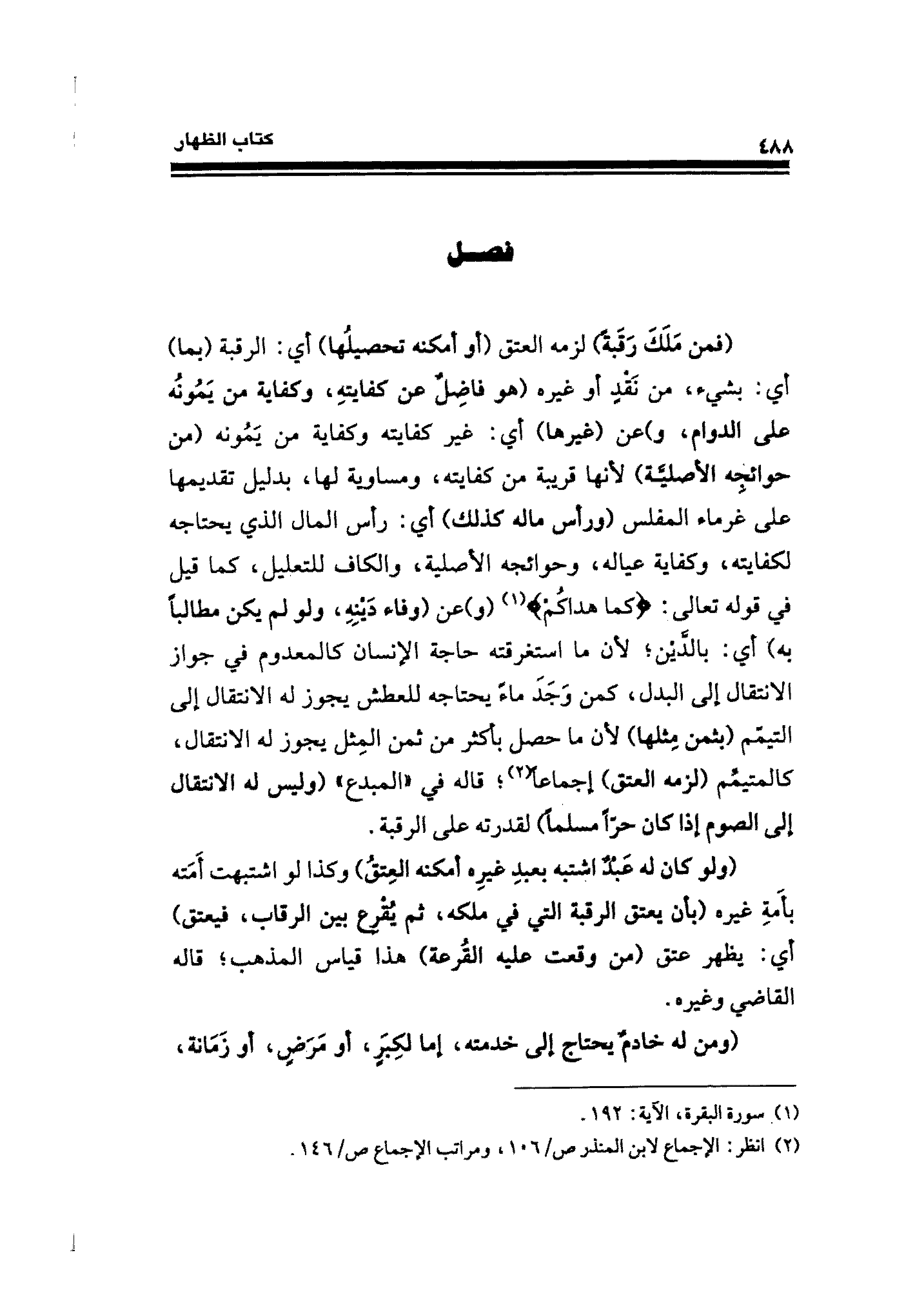 (فمن مَلَكَ رَقَبةً) لزمه العتق (أو أمكنه تحصيلُها) أي: الرقبة (بما) أي: بشيء، من نَقْدٍ أو غيره (هو فاضِلٌ عن كفايتِه، وكفاية من يَمُونُه على الدوام، و) عن (غيرها) أي: غير كفايته وكفاية من يَمُونه (من حوائجِه الأصليَّة) لأنها قريبة من كفايته، ومساوية لها، بدليل تقديمها على غرماء المفلس (ورأس ماله كذلك) أي: رأس المال الذي يحتاجه لكفايته، وكفاية عياله، وحوائجه الأصلية، والكاف للتعليل، كما قيل في قوله تعالى: {كَمَا هَدَاكُمْ} (¬١) (و) عن (وفاء دَينِهِ، ولو لم يكن مطالبًا به) أي: بالدَّين؛ لأن ما استغرقته حاجة الإنسان كالمعدوم في جواز الانتقال إلى البدل، كمن وَجَدَ ماءً يحتاجه للعطش يجوز له الانتقال إلى التيمّم (بثمن مِثلها) لأن ما حصل بأكثر من ثمن المِثل يجوز له الانتقال، كالمتيمِّم (لزمه العتق) إجماعًا (¬٢)؛ قاله في "المبدع" (وليس له الانتقال إلى الصوم إذا كان حرًّا مسلمًا) لقدرته على الرقبة.