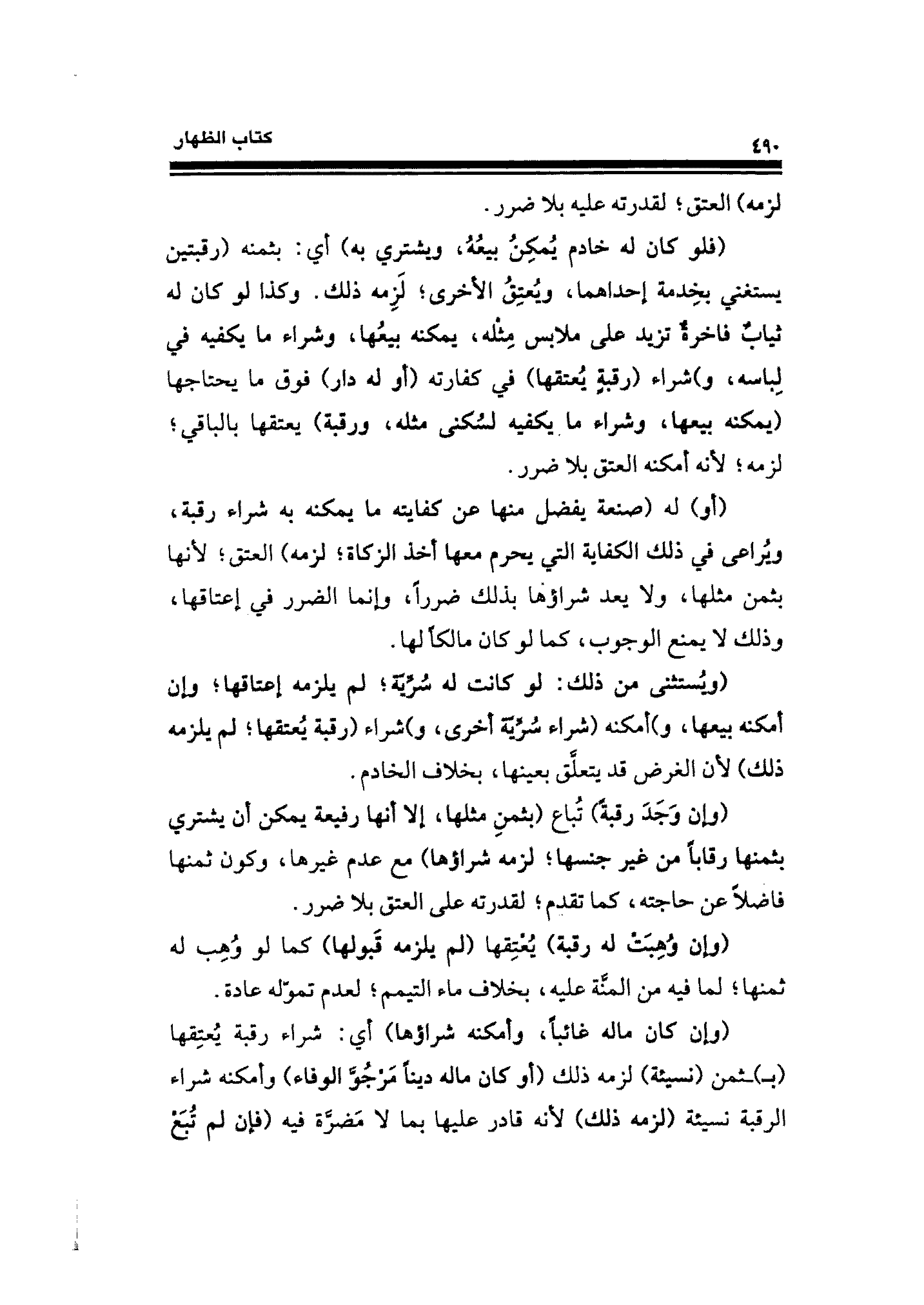 (فلو كان له خادم يُمكِنُ بِيعُهُ، ويشتري به) أي: بثمنه (رقبتين يستغني بخِدمة إحداهما، ويُعتِقُ الأخرى؛ لَزِمه ذلك. وكذا لو كان له ثيابٌ فاخرةٌ تزيد على ملابس مِثْله، يمكنه بيعُها، وشراء ما يكفيه في لِباسه، و) شراء (رقبةٍ يُعتقها) فِي كفارته (أو له دار) فوق ما يحتاجها (يمكنه بيعها، وشراء ما يكفيه لسُكنى مثله، ورقبة) يعتقها بالباقي؛ لزمه؛ لأنه أمكنه العتق بلا ضرر.