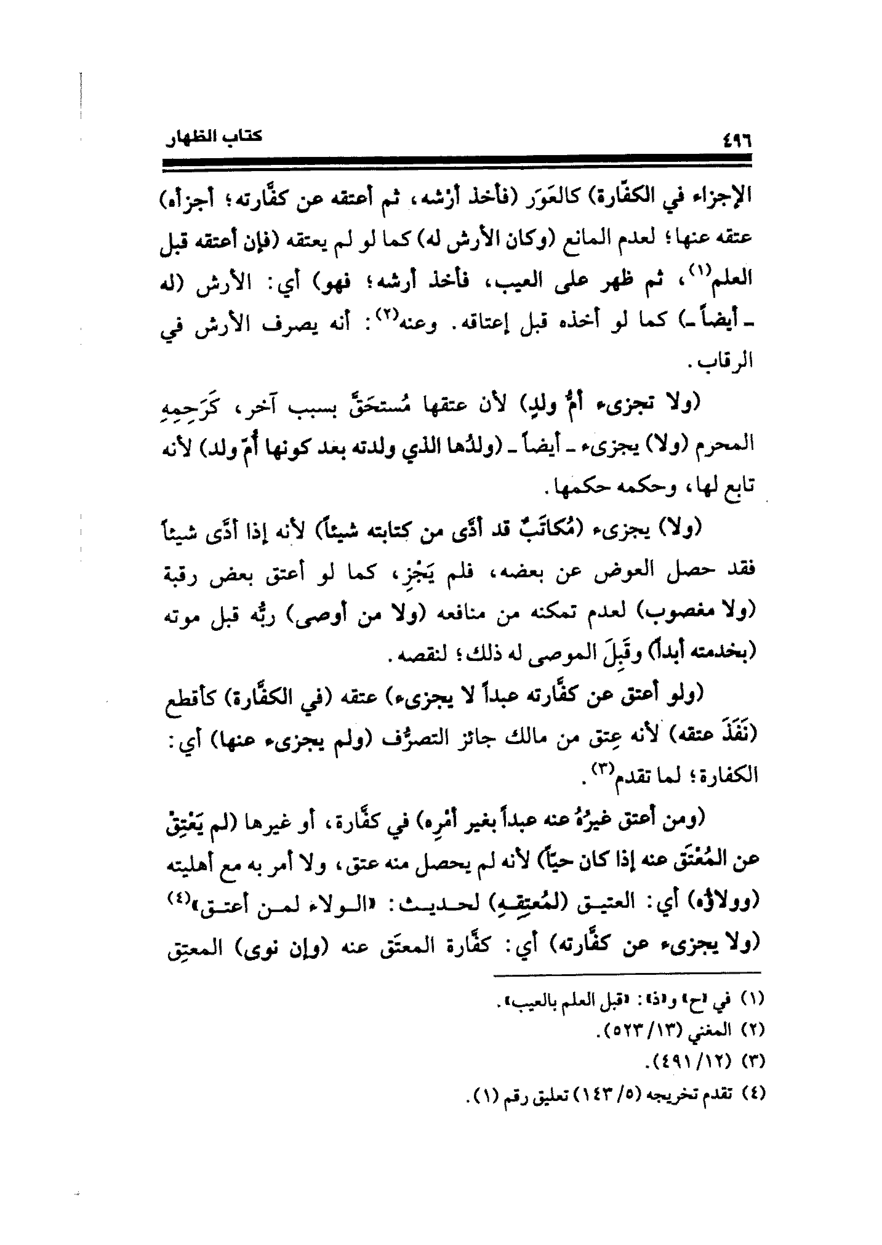 (ولا تجزئ أمُّ ولدٍ) لأن عتقها مُستحَقٌّ بسبب آخر، كَرَحِمِهِ المحرم (ولا) يجزئ -أَيضًا- (ولدُها الذي ولدته بعد كونها أُمّ ولد) لأنه تابع لها، وحكمه حكمها.
