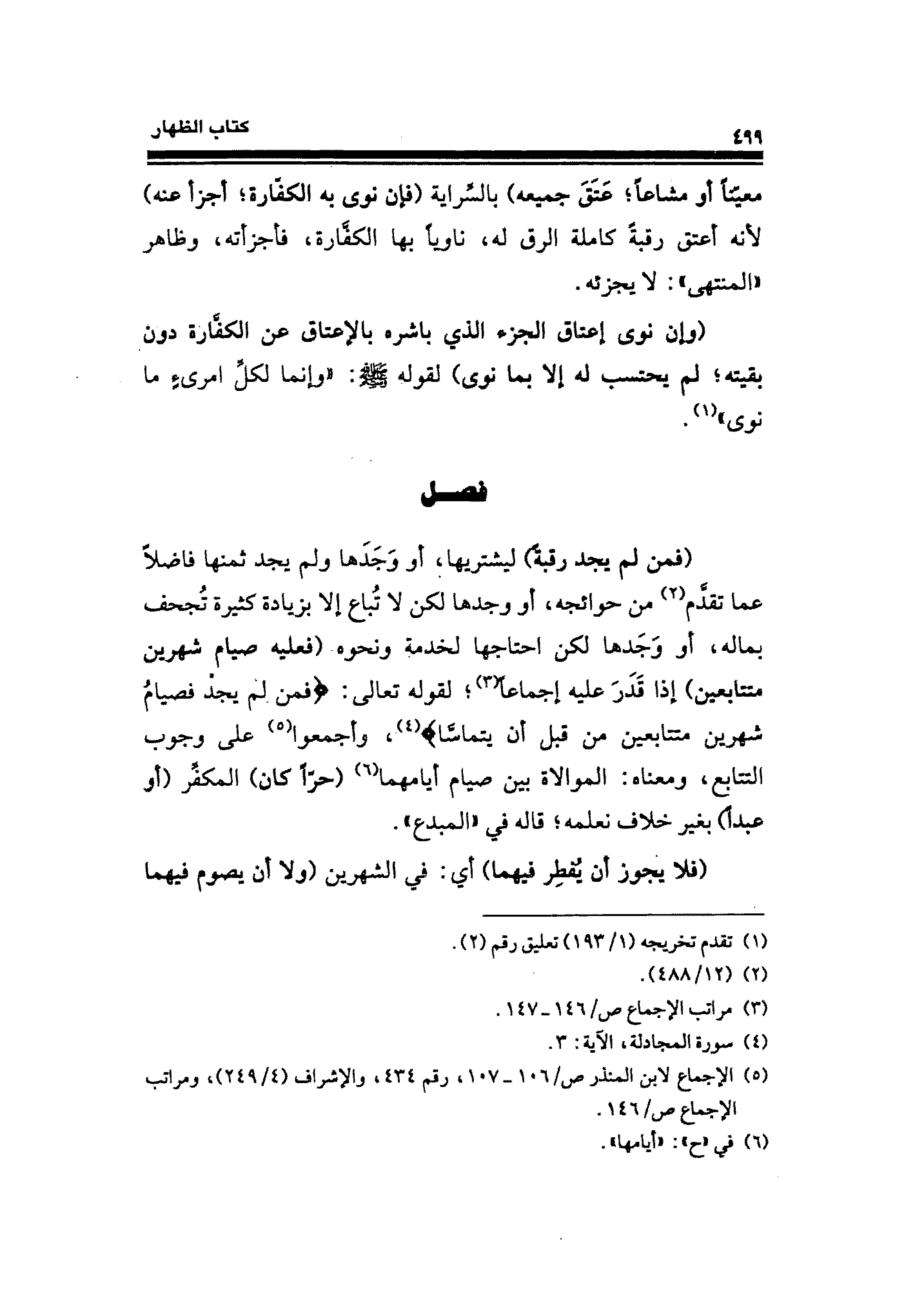 (فمن لم يجد رقبةً) ليشتريها، أو وجَدَها ولم يجد ثمنها فاضلًا عما تقدَّم (¬٢) من حوائجه، أو وجدها لكن لا تُباع إلَّا يزيادة كثيرة تُجحف بماله، أو وَجَدها لكن احتاجها لخدمة ونحوه. (فعليه صيام شهرين متتابعين) إذا قَدَرَ عليه إجماعًا (¬٣)؛ لقوله تعالى: {فَمَنْ لَمْ يَجِدْ فَصِيَامُ شَهْرَينِ مُتَتَابِعَينِ مِنْ قَبْلِ أَنْ يَتَمَاسَّا} (¬٤)، وأجمعوا (¬٥) على وجوب التتابع، ومعناه: الموالاة بين صيام أيامهما (¬٦) (حرًّا كان) المكفِّر (أو عبدًا) بغير خلاف نعلمه؛ قاله في "المبدع".