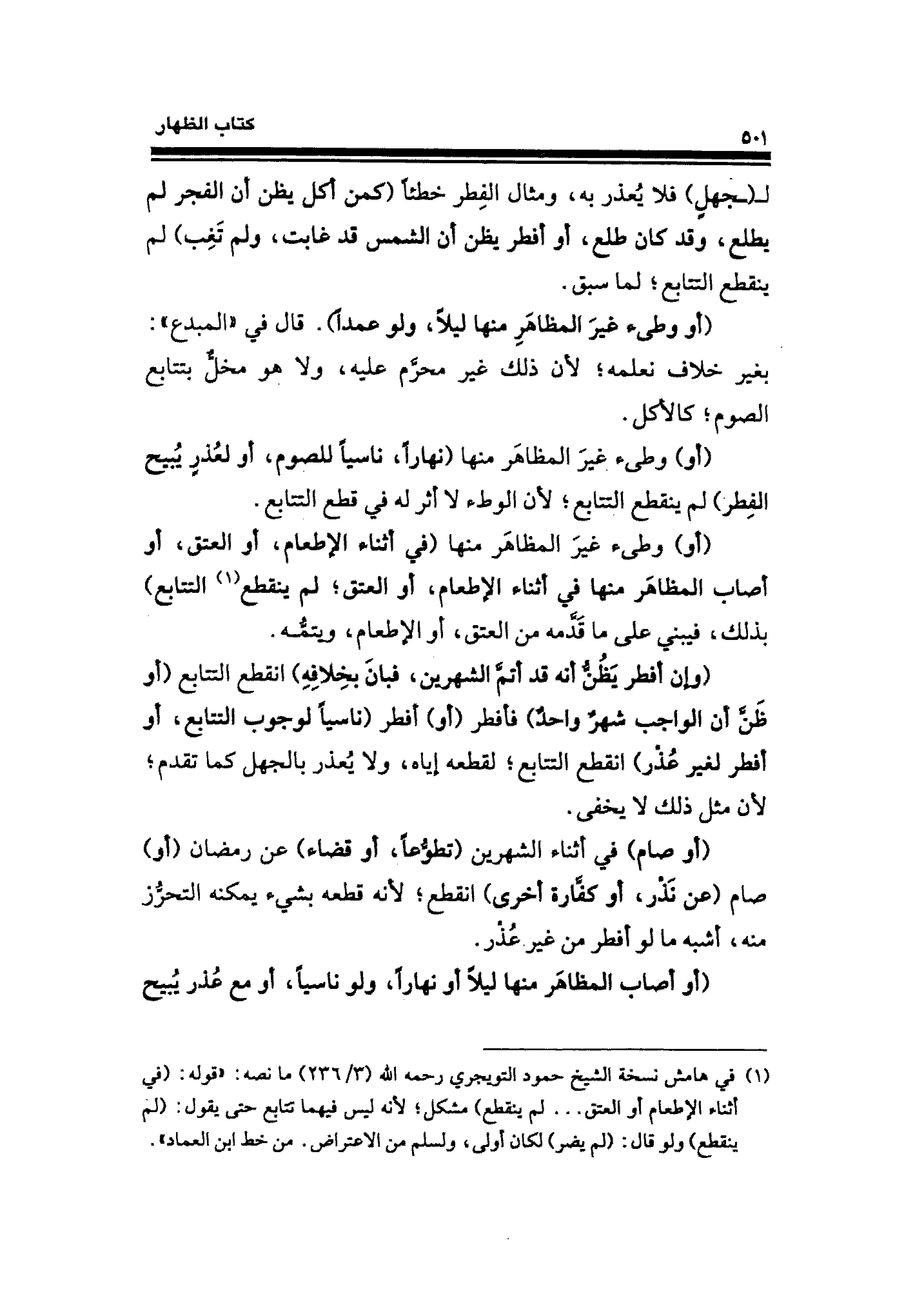 (¬١) في هامش نسخة الشيخ حمود التويجري رحمه الله (٣/ ٢٣٦) ما نصه: "قوله: (في أثناء الإطعام أو العتق ... لم ينقطع) مشكل؛ لأنه ليس فيهما تتابع حتى يقول: (لم ينقطع) ولو قال: (لم يضر) لكان أولى، ولسلم من الاعتراض. من خط ابن العماد".
