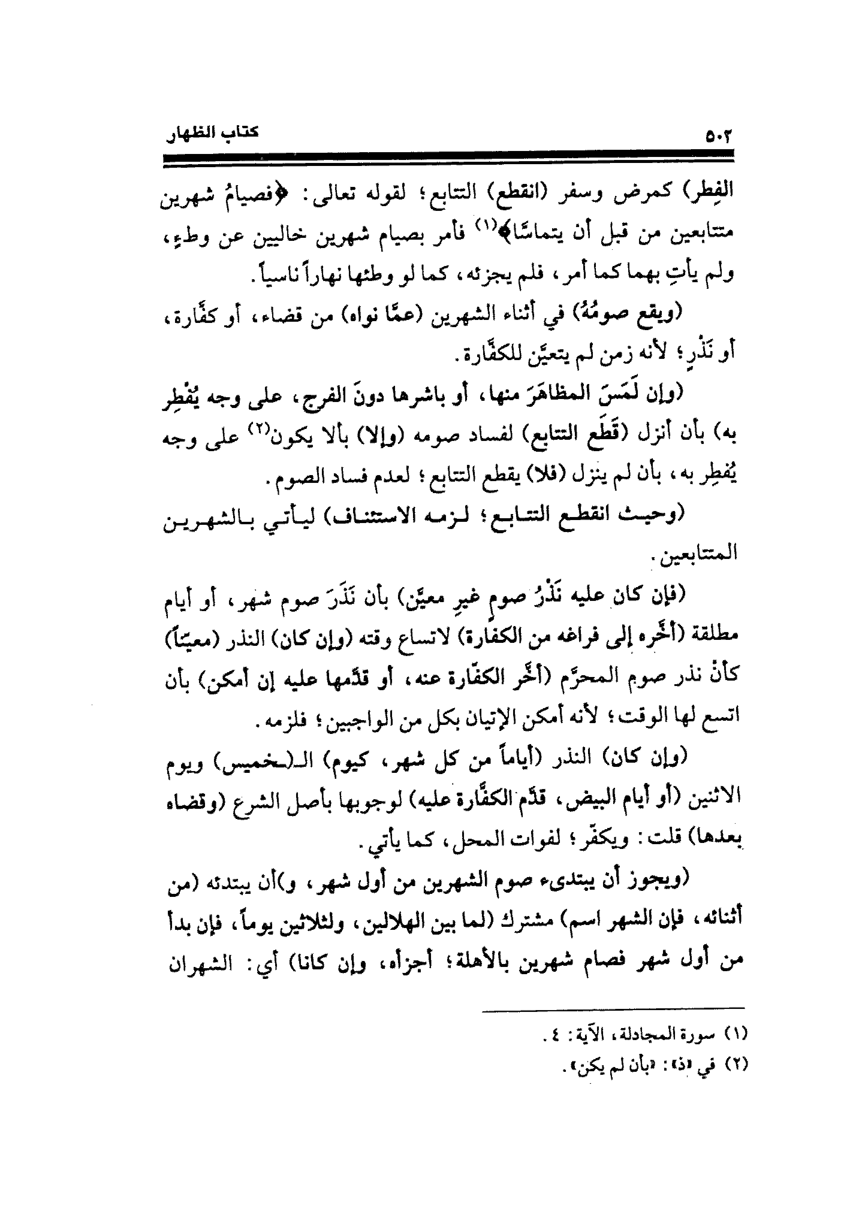 الفِطر) كمرض وسفر (انقطع) التتابع؛ لقوله تعالى: {فَصِيَامُ شَهْرَينِ مُتَتَابِعَينِ مِنْ قَبْلِ أَنْ يَتَمَاسَّا} (¬١) فأمر بصيام شهرين خاليين عن وطءٍ، ولم يأتِ بهما كما أمر، فلم يجزئه، كما لو وطئها نهارًا ناسيًا.