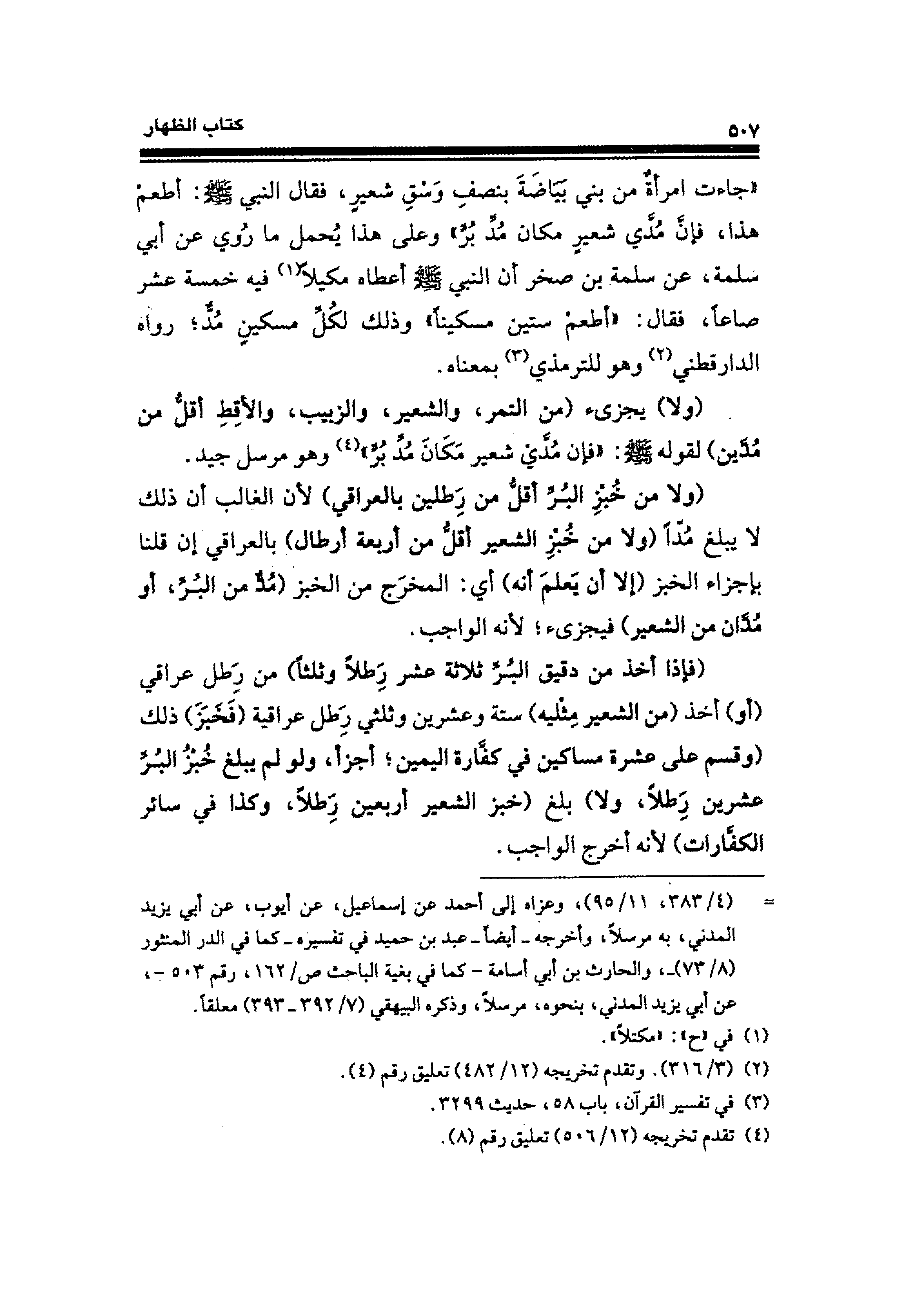 "جاءت امرأةٌ من بني بَيَاضَةَ بنصفِ وَسْقِ شعيرٍ، فقال النَّبِيّ - صلى الله عليه وسلم -: أطعمْ هذا، فإنَّ مُدَّي شعيرٍ مكان مُدِّ بُرٍّ" وعلى هذا يُحمل ما رُوي عن أبي سلمة، عن سلمة بن صخر أن النَّبِيّ - صلى الله عليه وسلم - أعطاه مكيلًا (¬١) فيه خمسة عشر صاعًا، فقال: "أطعمْ ستين مسكينًا" وذلك لكُلِّ مسكينٍ مُدٌّ؛ رواه الدارقطني (¬٢) وهو للترمذي (¬٣) بمعناه.