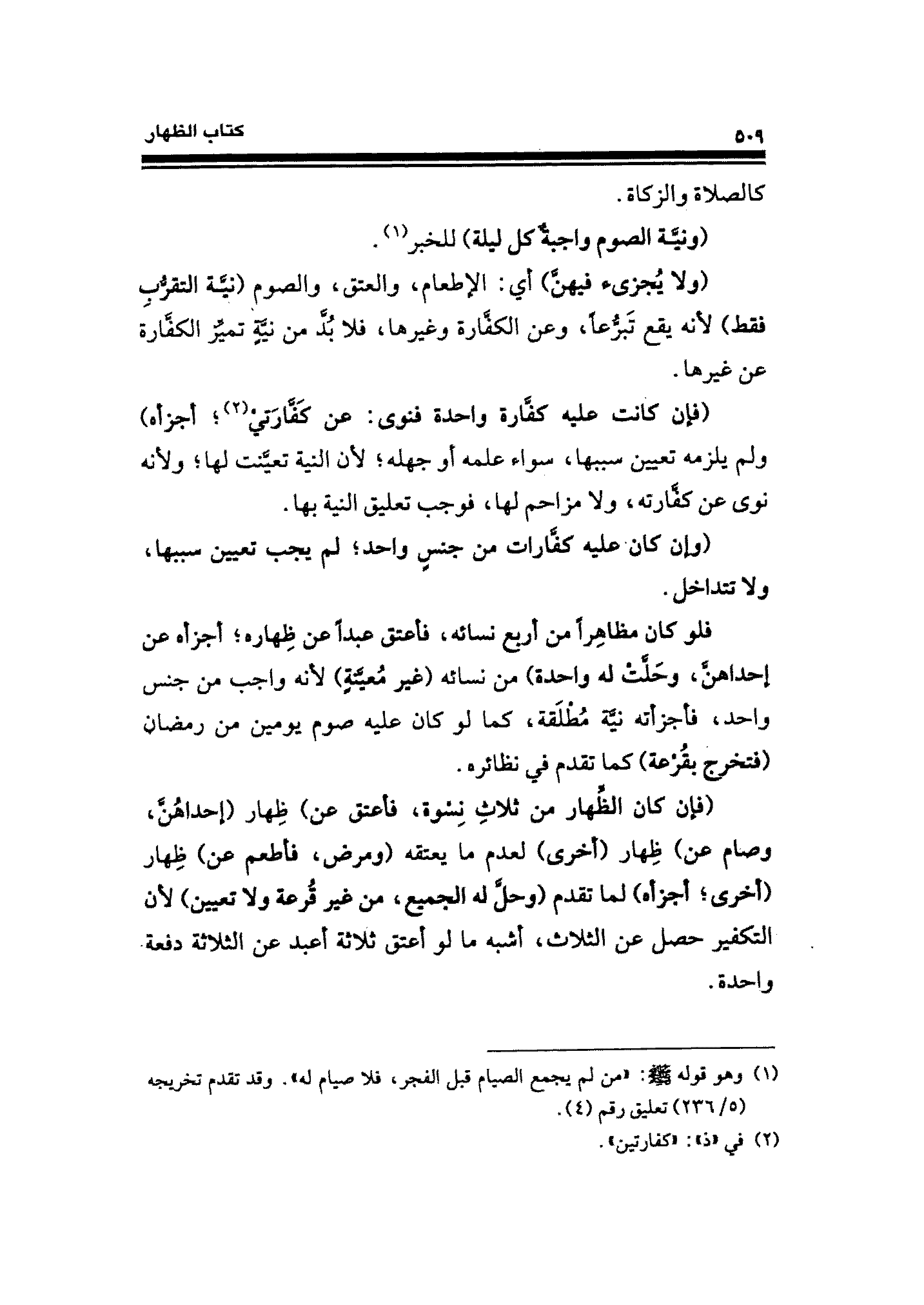 (فإن كانت عليه كفارة واحدة فنوى: عن كفارتي (¬٢)؛ أجزأه) ولم يلزمه تعيين شببها، سواء علمه أو جهله؛ لأن النية تعينت لها؛ ولأنه نوى عن كفَّارته، ولا مزاحم لها، فوجب تعليق النية بها.