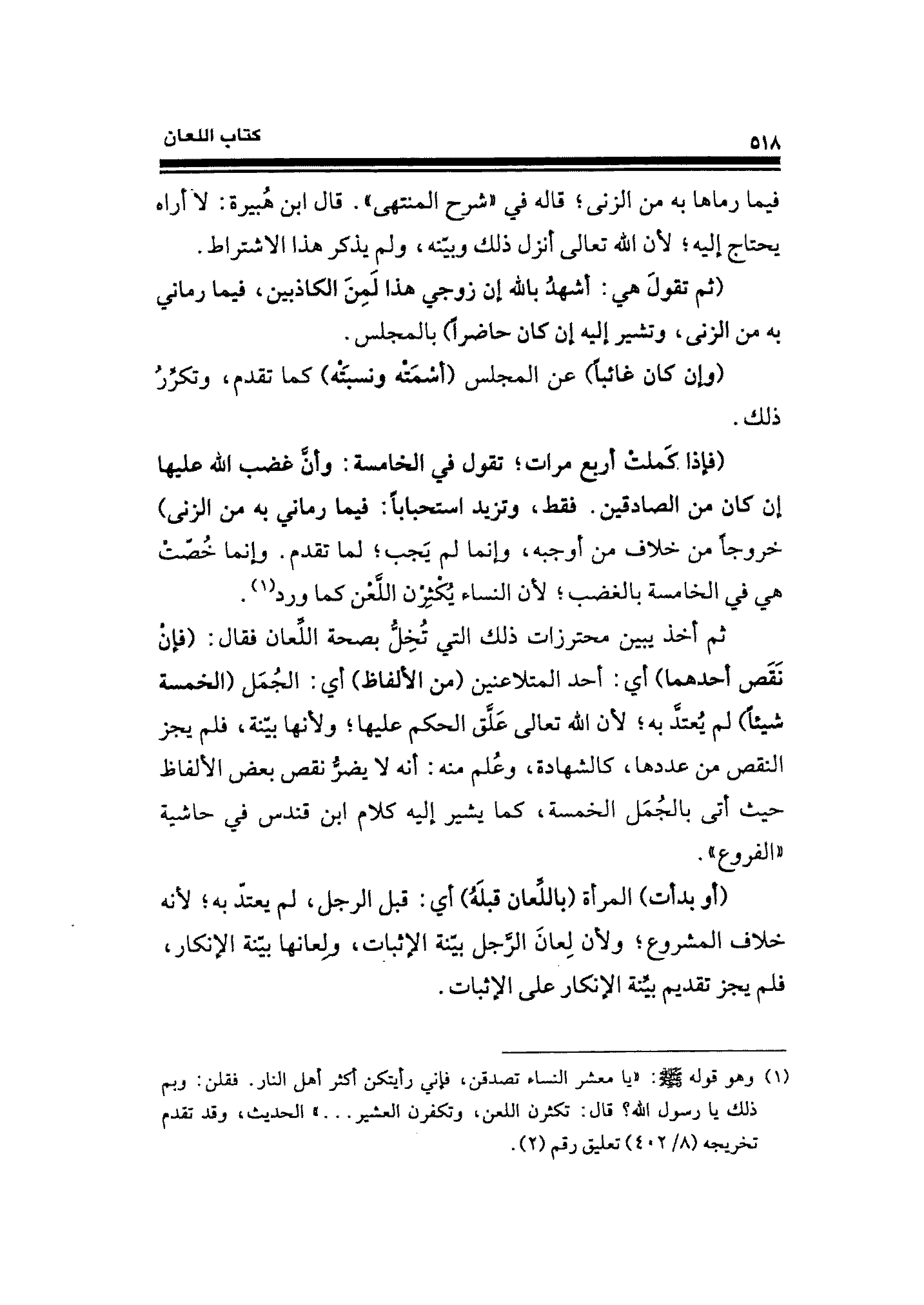 (فإذا كَملتْ أربع مرات؛ تقول في الخامسة: وأنَّ غضب الله عليها إن كان من الصادقين. فقط، وتزيد استحبابًا: فيما رماني به من الزنى) خروجًا من خلاف من أوجبه، وإنما لم يَجب؛ لما تقدم. وإنما خُصّتْ هي في الخامسة بالغضب؛ لأن النساء يُكْثِرْن اللَّعْن كما ورد (¬١).