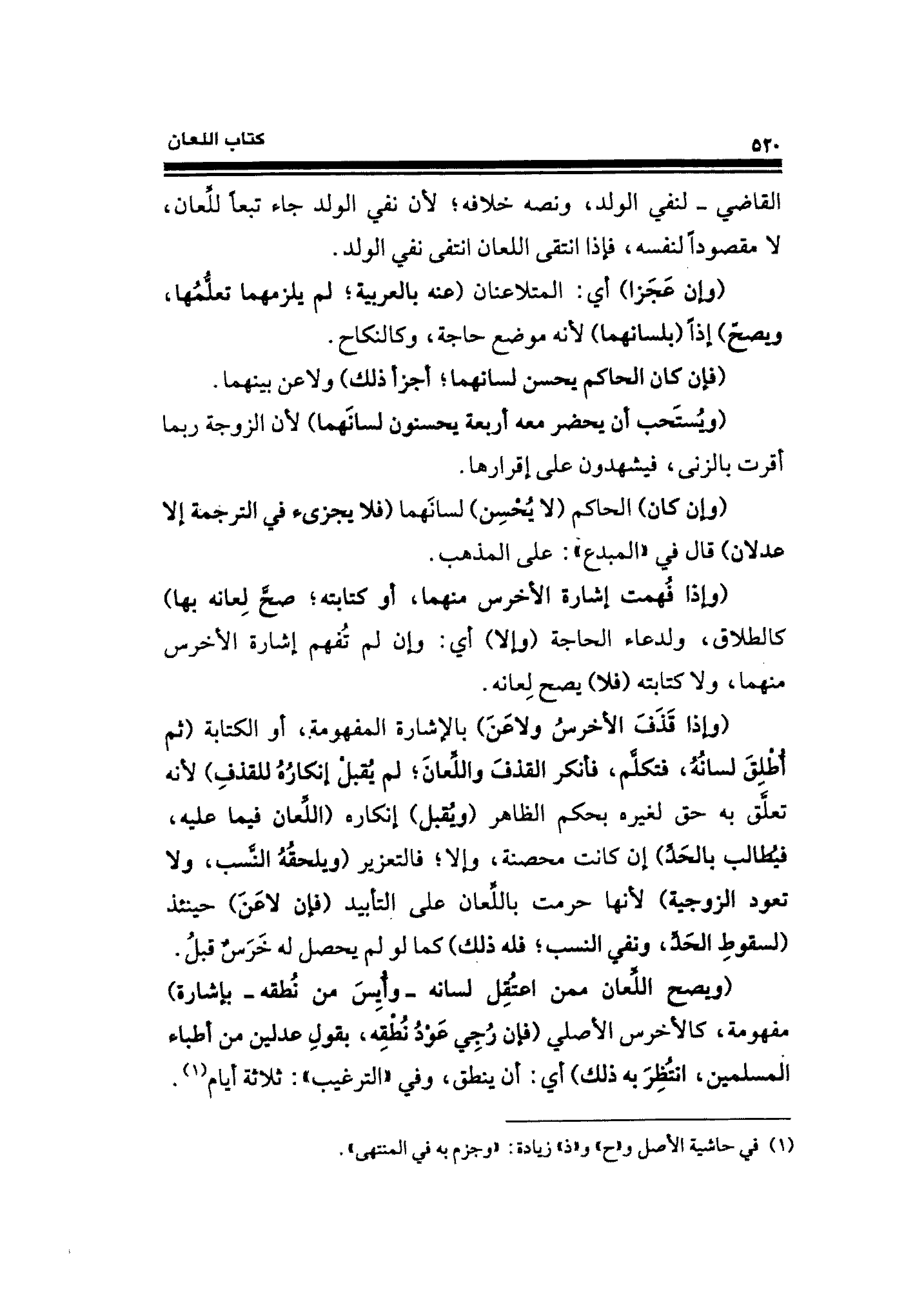 (ويصح اللِّعان ممن اعتُقِل لسانه -وأُيِسَ من نُطقه- بإشارة) مفهومة، كالأخرس الأصلي (فإن رُجِي عَوْدُ نُطْقِه، بقولِ عدلين من أطباء المسلمين، انتُظِرَ به ذلك) أي: أن ينطق، وفي "الترغيب": ثلاثة أيام (¬١).