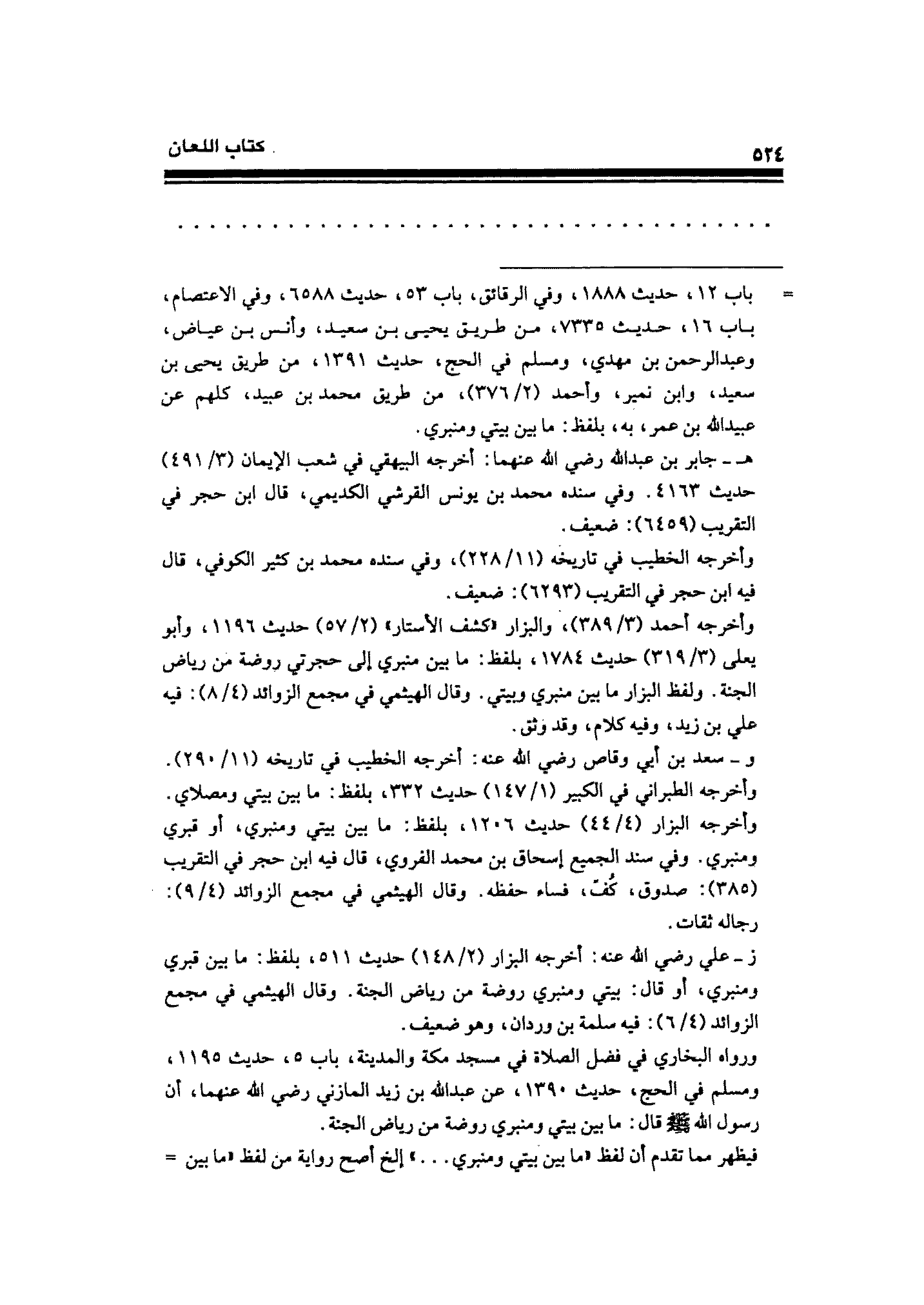 ز- علي - رضي الله عنه -: أخرجه البزار (٢/ ١٤٨) حديث ٥١١، بلفظ: ما بين قبري ومنبري، أو قال: بيتي ومنبري روضة من رياض الجنة، وقال الهيثمي في مجمع الزوائد (٤/ ٦): فيه سلمة بن وردان، وهو ضعيف.