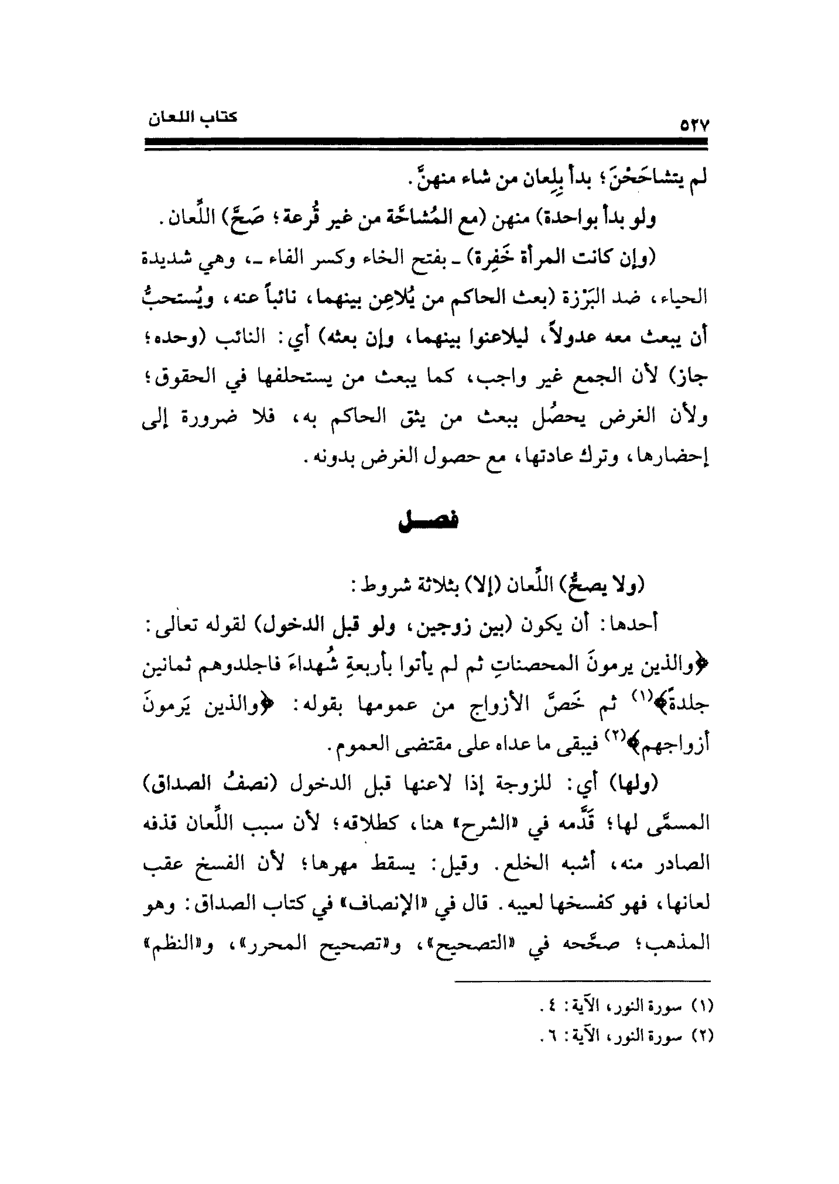 (ولها) أي: للزوجة إذا لاعنها قبل الدخول (نصفُ الصداق) المسمَّى لها؛ قَدَّمه في "الشرح" هنا، كطلاقه؛ لأن سبب اللِّعان قذفه الصادر منه، أشبه الخلع. وقيل: يسقط مهرها؛ لأن الفسخ عقب لعانها، فهو كفسخها لعيبه. قال في "الإنصاف" في كتاب الصداق: وهو المذهب؛ صحَّحه في "التصحيح"، و"تصحيح المحرر"، و"النظم"