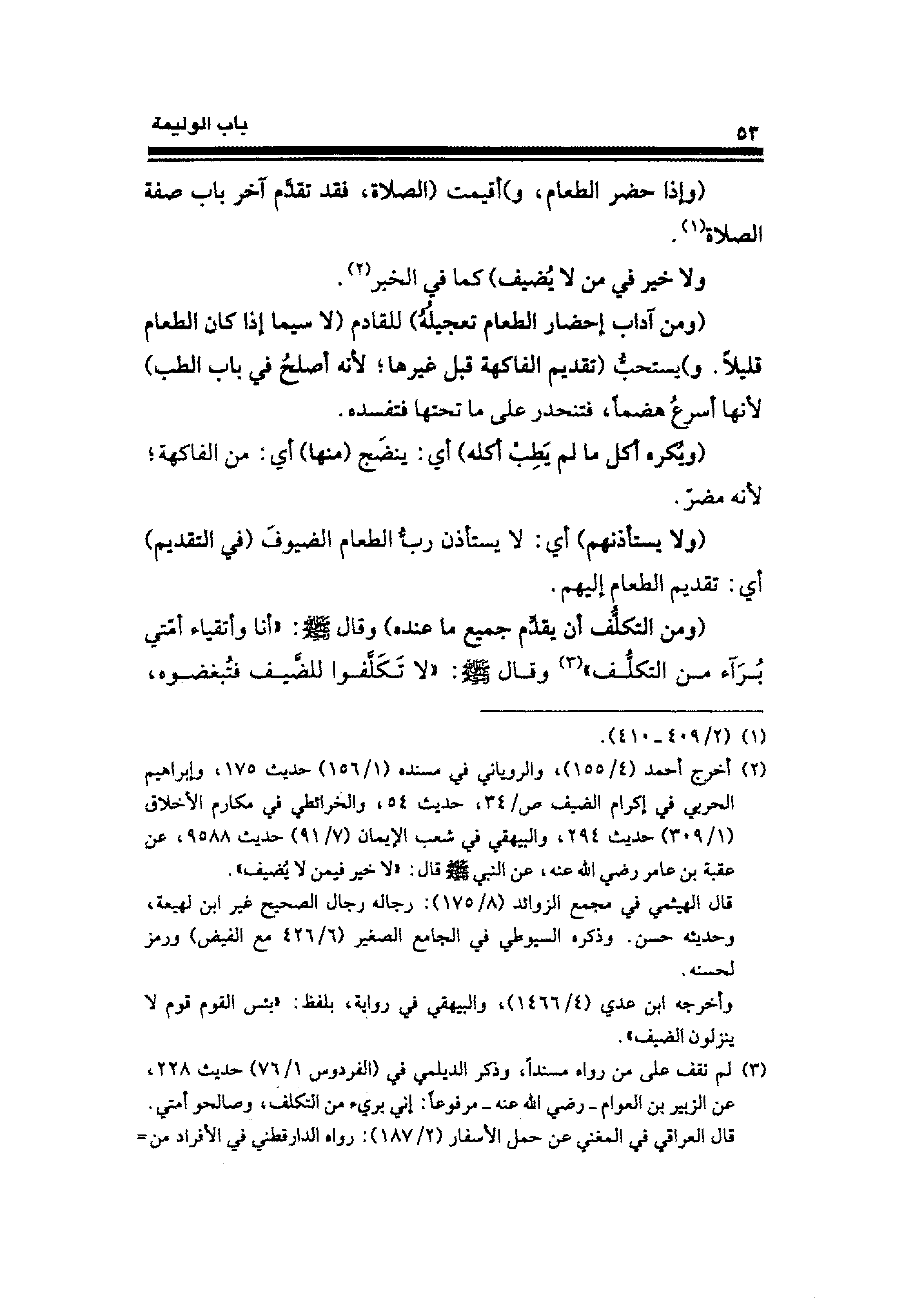(¬٢) أخرج أحمد (٤/ ١٥٥)، والروياني في مسنده (١/ ١٥٦) حديث ١٧٥، وإبراهيم الحربي في إكرام الضيف ص / ٣٤، حديث ٥٤، والخرائطي في مكارم الأخلاق (١/ ٣٠٩) حديث ٢٩٤، والبيهقي في شعب الإيمان (٧/ ٩١) حديث ٩٥٨٨، عن عقبة بن عامر رضي الله، عن النبي - صلى الله عليه وسلم - قال: "لا خير فيمن لا يُضيف".