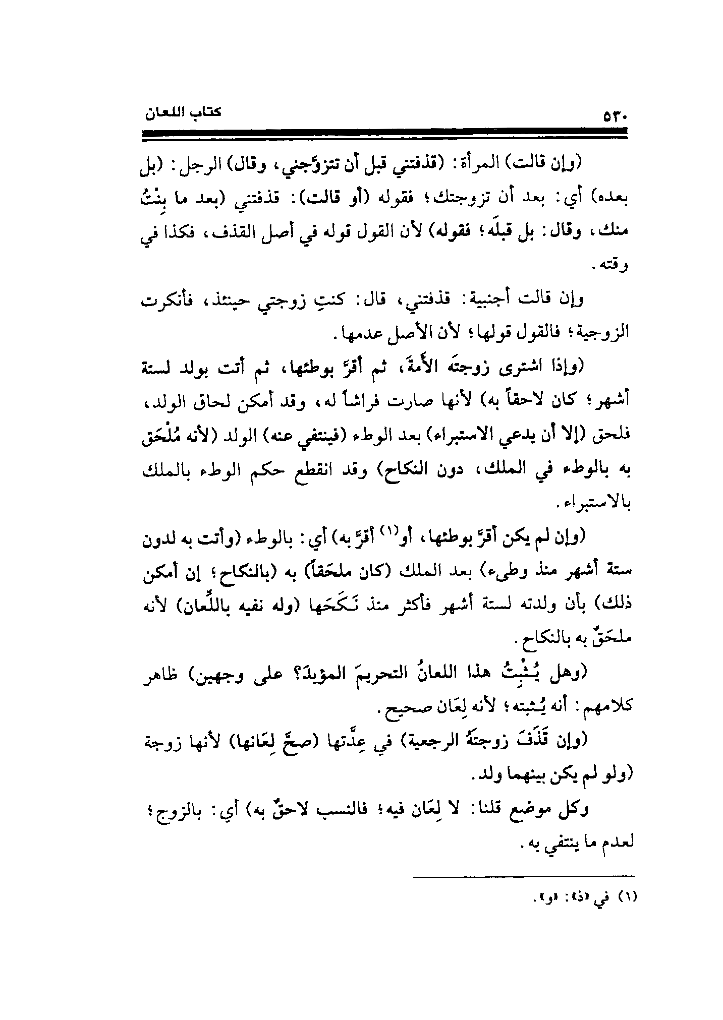 (وإن قالت) المرأة: (قذفتني قبل أن تتزوَّجني، وقال) الرجل: (بل بعده) أي: بعد أن تزوجتك؛ فقوله (أو قالت): قذفتني (بعد ما بِنْتُ منك، وقال: بل قبلَه؛ فقوله) لأن القول قوله في أصل القذف، فكذا في وقته.