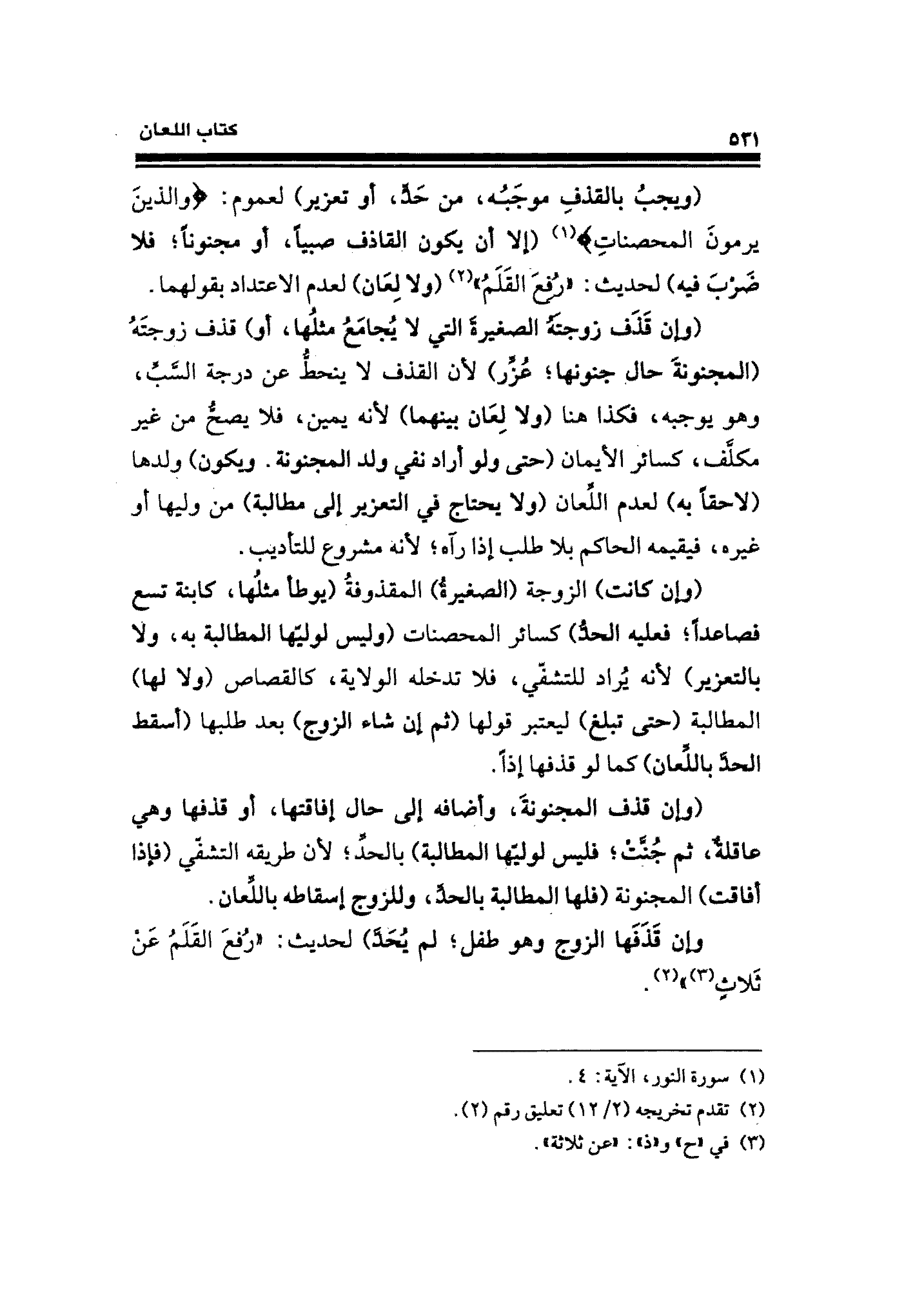 (ويجبُ بالقذفِ موجَبُه، من حَدٍّ، أو تعزير) لعموم: {وَالَّذِينَ يَرْمُونَ الْمُحْصَنَاتِ} (¬١) (إلَّا أن يكون القاذف صبيًّا، أو مجنونًا؛ فلا ضَرْبَ فيه) لحديث: "رُفِعَ القَلَمُ" (¬٢) (ولا لِعَان) لعدم الاعتداد بقولهما.