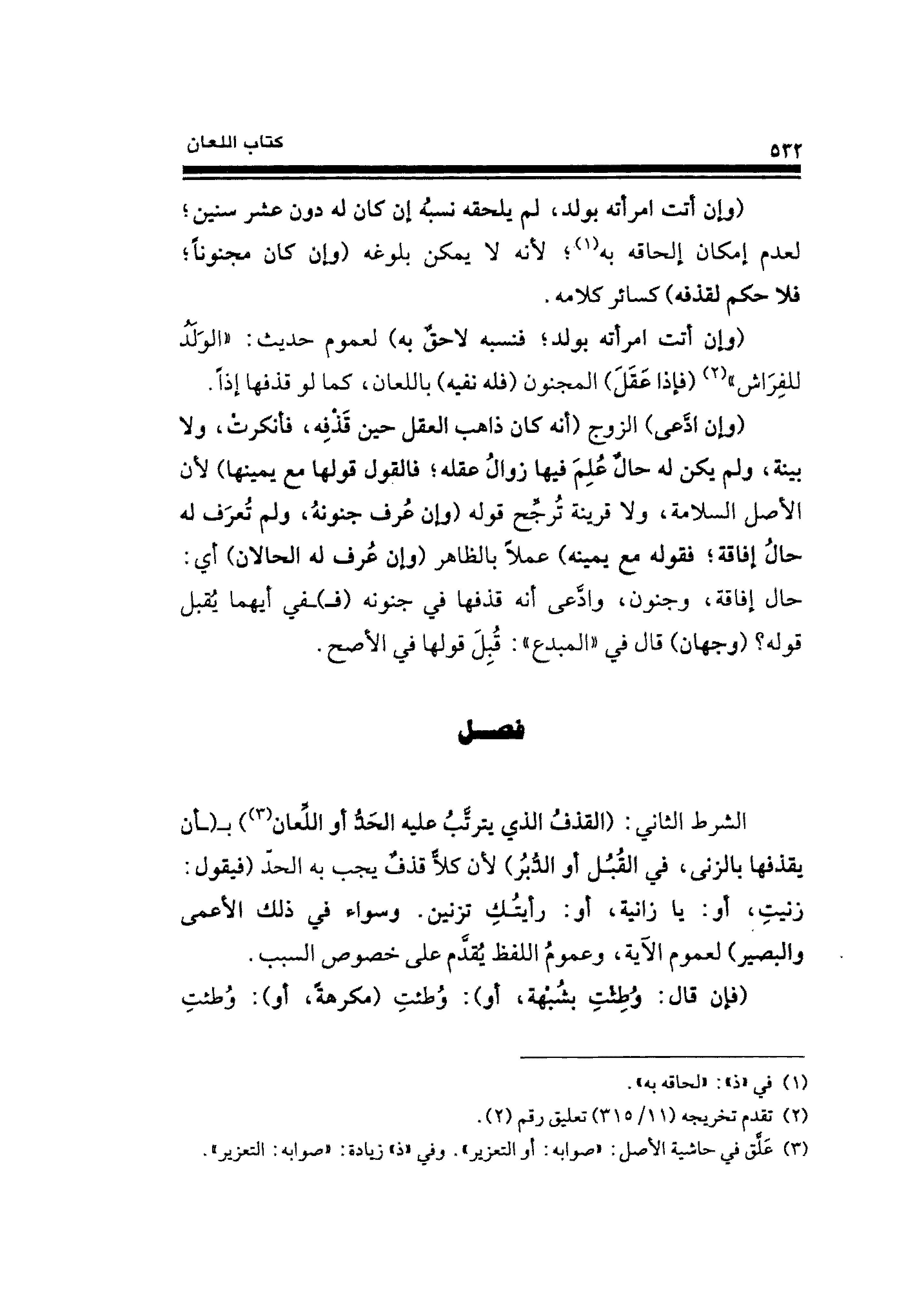 الشرط الثاني: (القذفُ الذي يترتَّبُ عليه الحَدُّ أو اللِّعان (¬٣)) بـ) ـأن يقذفها يالزنى، في القُبُل أو الدُّبُر) لأن كلًّا قذفٌ يجب به الحدّ (فيقول: زنيتِ، أو: يا زانية، أو: رأيتُكِ تزنين. وسواء في ذلك الأعمى والبصير) لعموم الآية، وعمومُ اللفظ يُقدَّم على خصوص السبب.