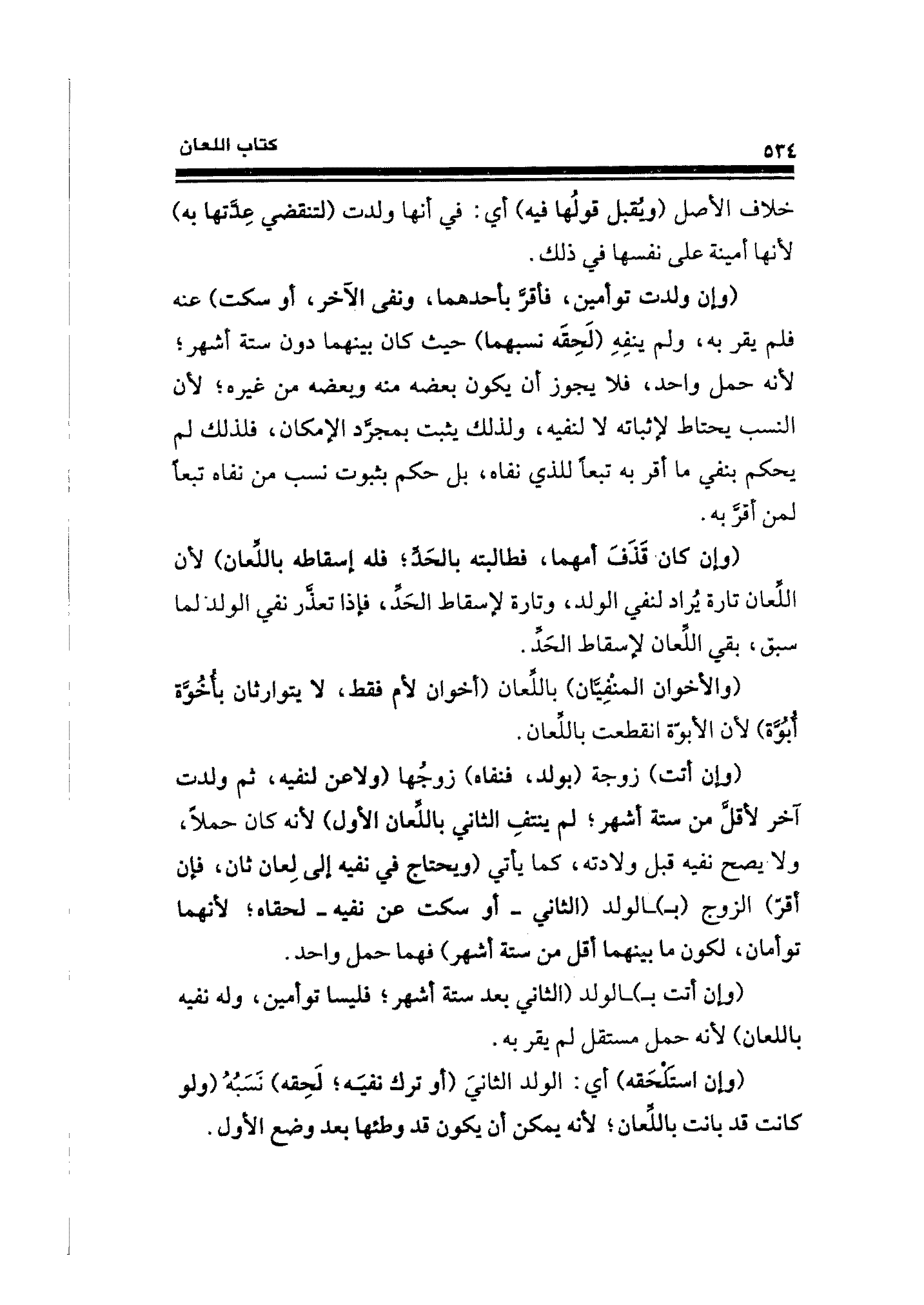 (وإن أتت) زوجة (بولد، فنفاه) زوجُها (ولاعن لنفيه، ثم ولدت آخر لأقلَّ من ستة أشهر؛ لم ينتفِ الثاني باللِّعان الأول) لأنه كان حملًا، ولا يصح نفيه قبل ولادته، كما يأتي (ويحتاج في نفيه إلى لِعان ثان، فإن أقرّ) الزوج (بـ) ـالولد (الثاني -أو سكت عن نفيه- لحقاه؛ لأنهما توأمان، لكون ما بينهما أقل من ستة أشهر) فهما حمل واحد.