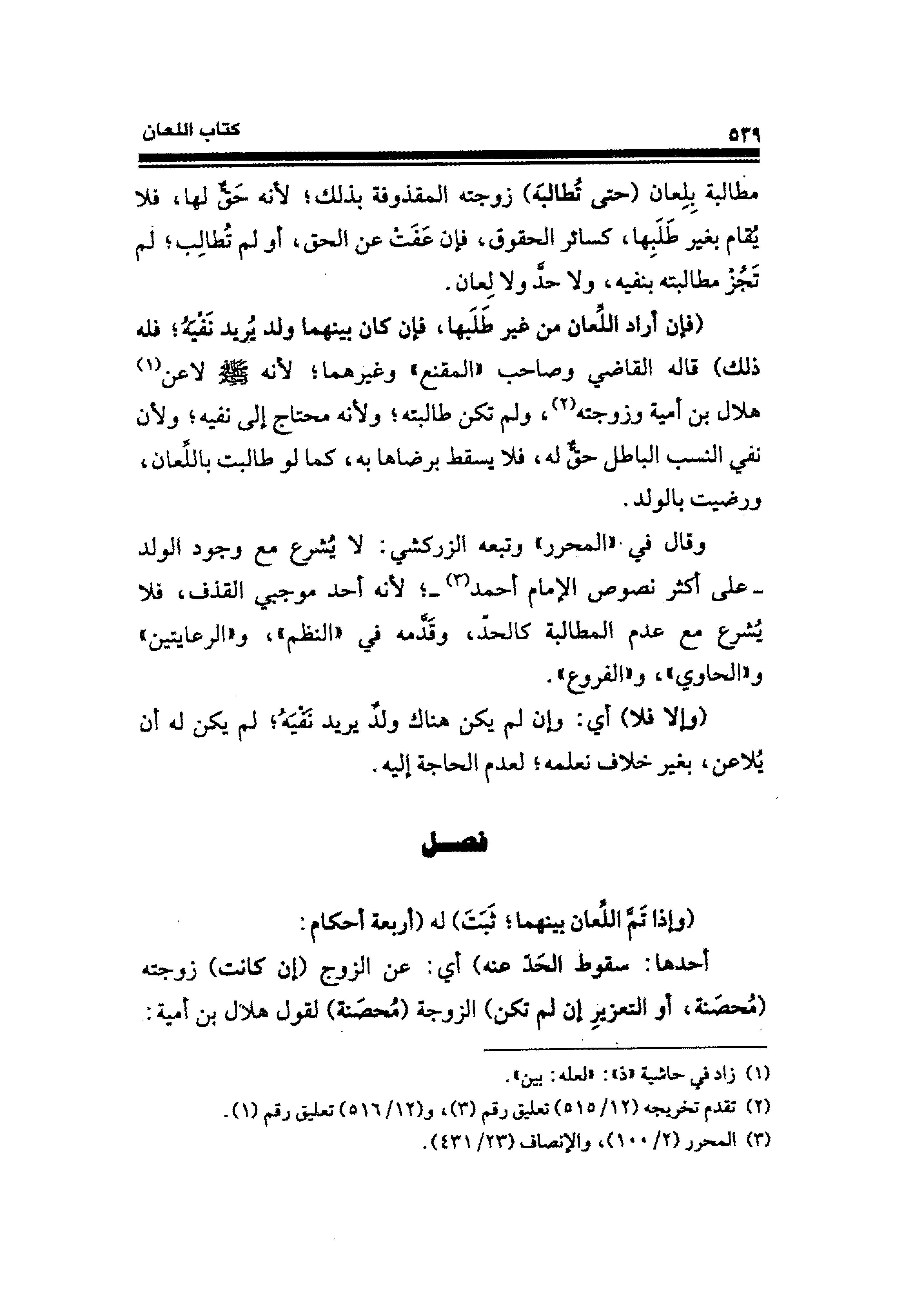 وقال في "المحرر" وتبعه الزركشي: لا يُشرع مع وجود الولد -على أكثر نصوص الإمام أحمد (¬٣) -؛ لأنه أحد موجبي القذف، فلا يُشرع مع عدم المطالبة كالحدّ، وقَدَّمه في "النظم" و "الرعايتين" و "الحاوي"، و"الفروع".
