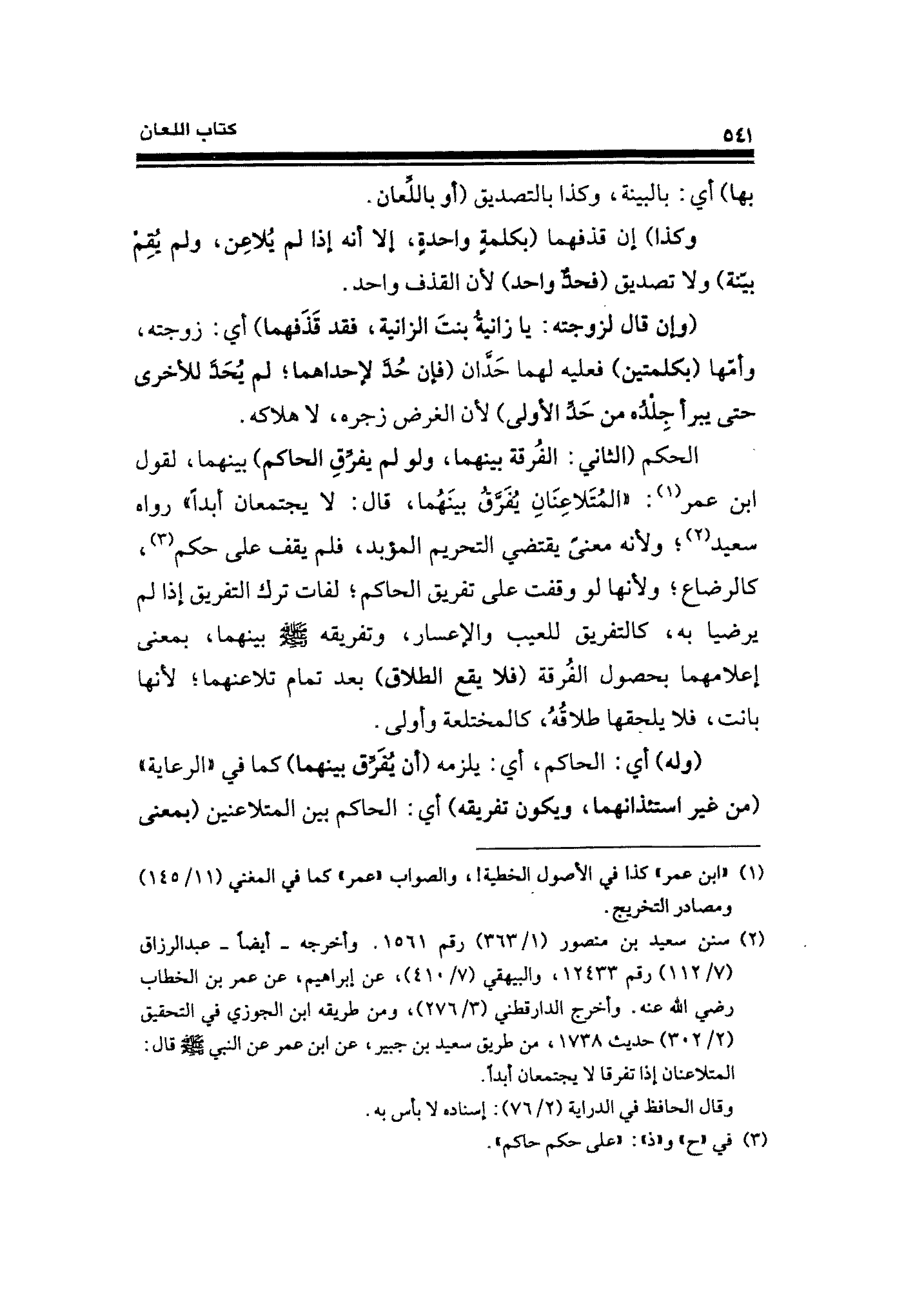 (¬٢) سنن سعيد بن منصور (١/ ٣٦٣) رقم ١٥٦١. وأخرجه -أيضًا- عبد الرزاق (٧/ ١١٢) رقم ١٢٤٣٣، والبيهقي (٧/ ٤١٠)، عن إبراهيم، عن عمر بن الخطاب رضي الله عنه. وأخرج الدارقطني (٣/ ٢٧٦)، ومن طريقه ابن الجوزي في التحقيق (٢/ ٣٠٢) حديث ١٧٣٨، من طريق سعيد بن جبير، عن ابن عمر عن النبي - صلى الله عليه وسلم - قال: المتلاعنان إذا تفرقا لا يجتمعان أبدًا.